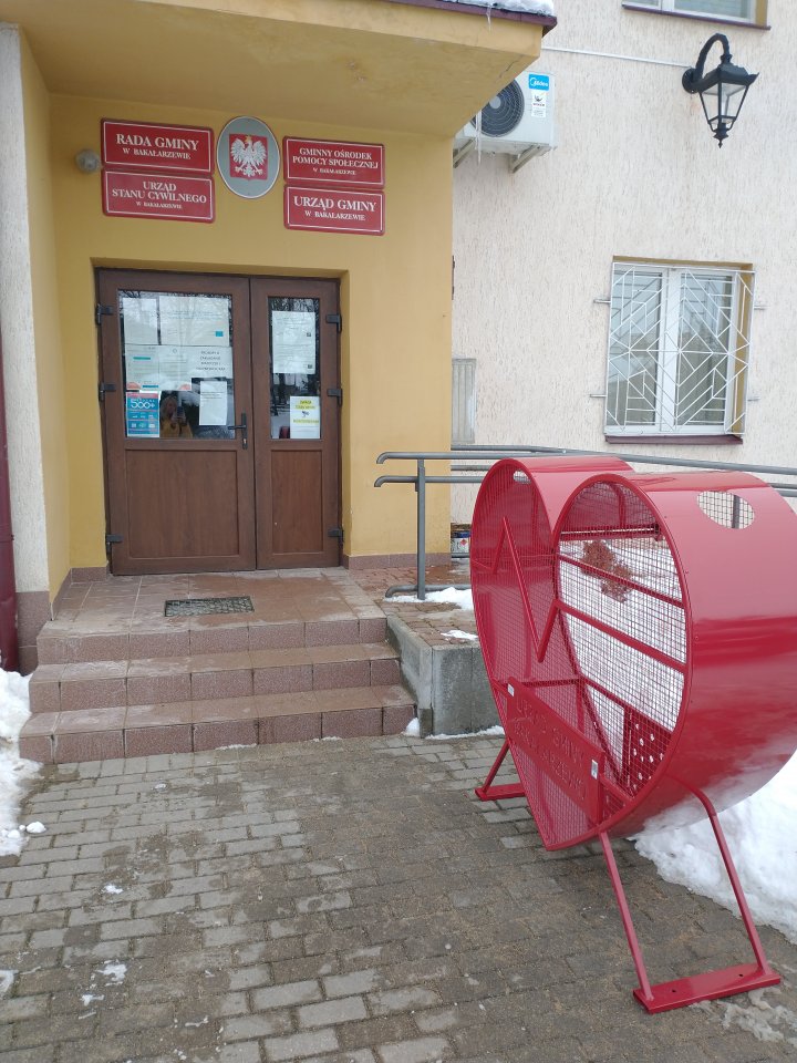 Przed Urzędem Gminy Bakałarzewo stanęło czerwone serce. To kosz na plastikowe nakrętki, które będą następnie przekazywane na akcje charytatywne.