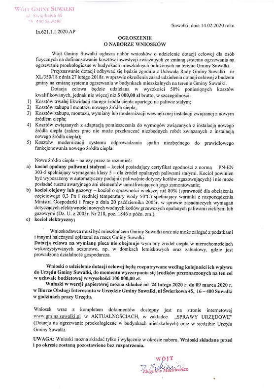 Urząd Gminy Suwałki informuje o naborze wniosków o udzielenie dotacji celowej dla osób fizycznych na dofinansowanie kosztów inwestycji związanych ze zmianą systemu ogrzewania na ogrzewanie proekologiczne w budynkach mieszkalnych położonych na terenie Gminy Suwałki.