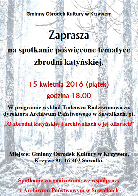 Gminny Ośrodek Kultury w Krzywem zaprasza na spotkanie poświęcone tematyce zbrodni katyńskiej - 15.04. 2016 (piątek), godzina 18.00. W programie wykład Tadeusza Radziwonowicza, dyrektora Archiwum Państwowego w Suwałkach, pt. „O zbrodni katyńskiej i archiwaliach o jej ofiarach”