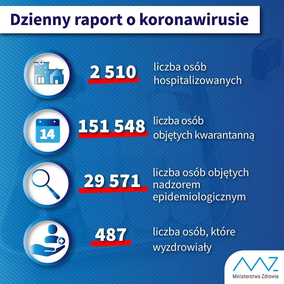 W sumie liczba zakażonych koronawirusem w Polsce wynosi 6934. Zmarło 245 osób, wyzdrowiało 487 osób.