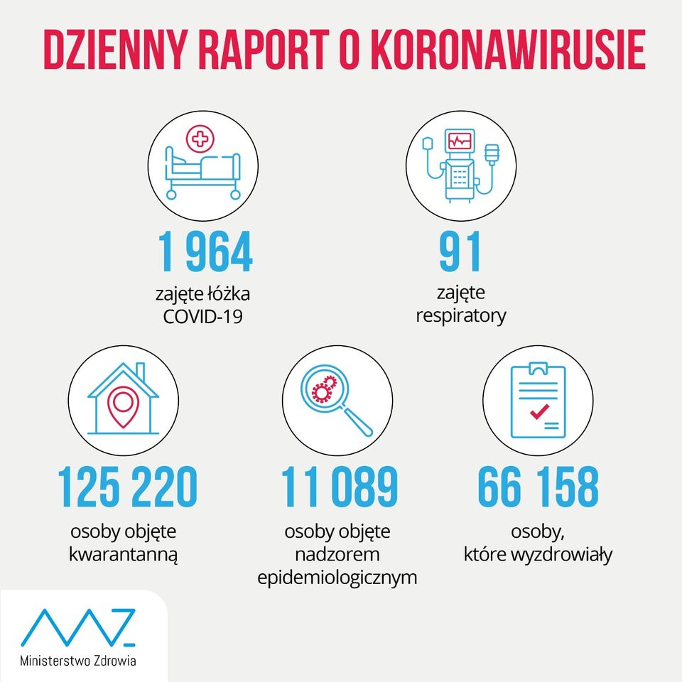 Resort zdrowia powiadomił o śmierci 25 osób zakażonych koronawirusem (wiek-płeć, miejsce zgonu): 72-M Kędzierzyn-Koźle, 72-M Lublin, 89-K Warszawa, 68-M, 92-M Bydgoszcz, 74-M Bełchatów, 64-M, 91-K Zgierz, 80-M Kraków, 89-M Mielec, 75-K Przemyśl, 83-K Sanok, 76-M Dębica, 65-M Łańcut, 71-M Augustów, 43-M Poznań (mieszkaniec woj. lubuskiego), 92-K, 80-K, 81-K, 69-M Poznań, 87-K Wejherowo, 50-K Częstochowa, 72-K, 75-M Tychy, 85-M Racibórz. Wszystkie osoby miały choroby współistniejące.