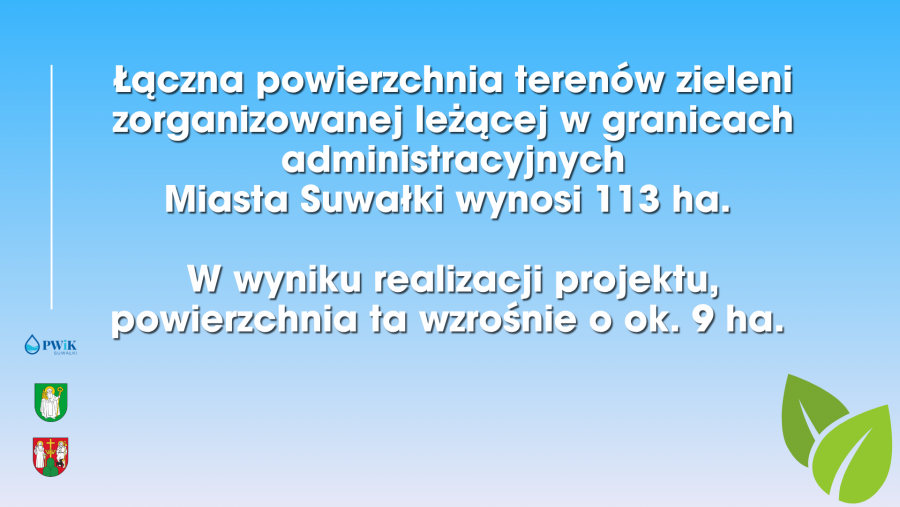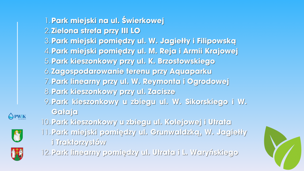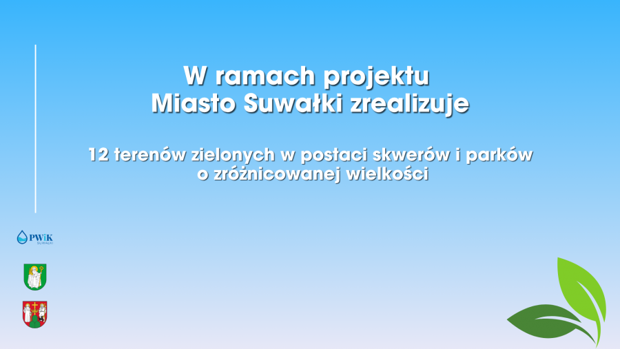 Dzięki realizacji projektu, Suwałki zyskają aż 12 nowych terenów zielonych – skwerów i parków o zróżnicowanej wielkości, które powstaną w różnych częściach miasta. Wśród nich znajdą się m.in.: zielona strefa przy III LO, parki miejskie przy ul. W. Jagiełły, Filipowskiej, M. Reja i Armii Krajowej, a także liczne parki kieszonkowe oraz zagospodarowanie terenu przy Aquaparku.- Jeszcze w tym roku ogłosimy przetarg na budowę wyczekiwanego przez Suwalczan parku przy ulicach Świerkowej i Nowomiejskiej – zapowiedział Marcin Bonisławski, zastępca Prezydenta Suwałk.
