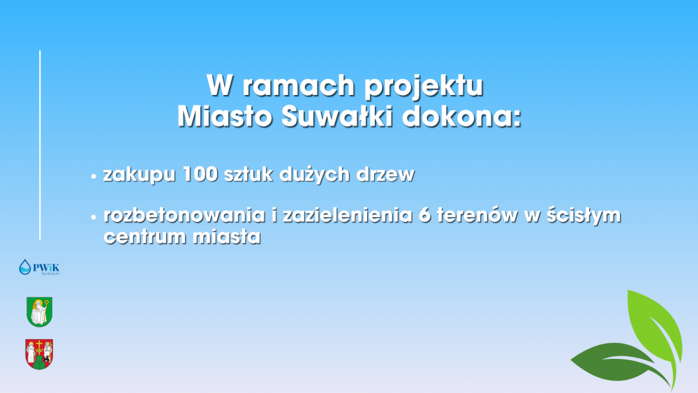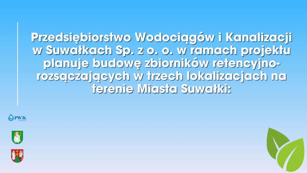 Miasto Suwałki, we współpracy z Przedsiębiorstwem Wodociągów i Kanalizacji w Suwałkach oraz Gminą Suwałki złożyło wniosek o dofinansowanie projektu „Zielone Suwałki”. Łączny budżet całego projektu to ponad 38,4 miliona złotych.