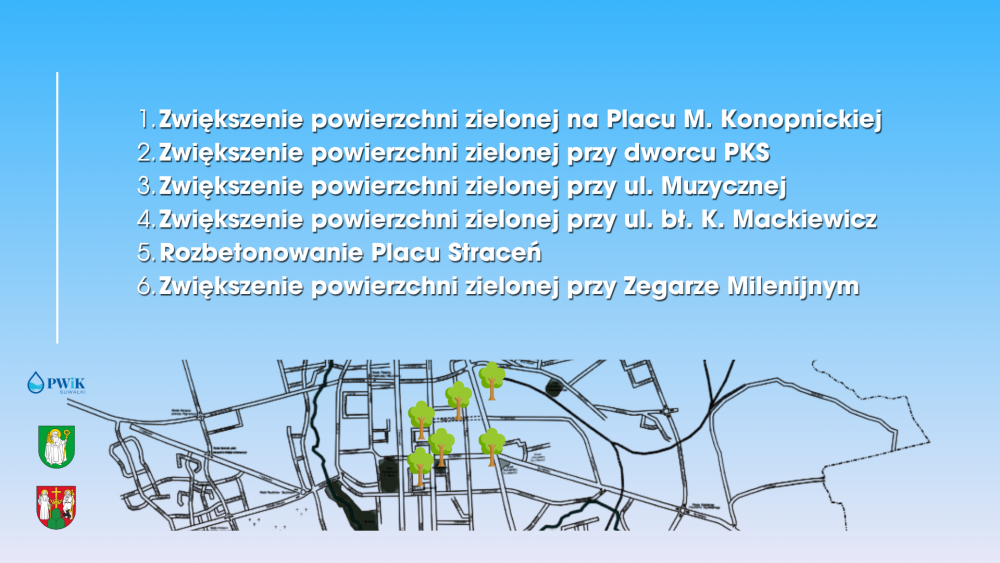 To nie wszystko! Zaplanowano również zakup 100 dużych drzew, które uzupełnią zieleń przyuliczną. W ścisłym centrum miasta nastąpi rozbetonowanie i zazielenienie sześciu kluczowych obszarów, takich jak Plac Marii Konopnickiej, tereny przy dworcu PKS, ulicy Muzycznej czy Placu Straceń. Te działania sprawią, że centrum Suwałk będzie bardziej zielone i estetyczne. Obecnie tereny zielone w granicach miasta zajmują 113 hektarów. Dzięki temu projektowi, ta powierzchnia wzrośnie o blisko 9 hektarów!