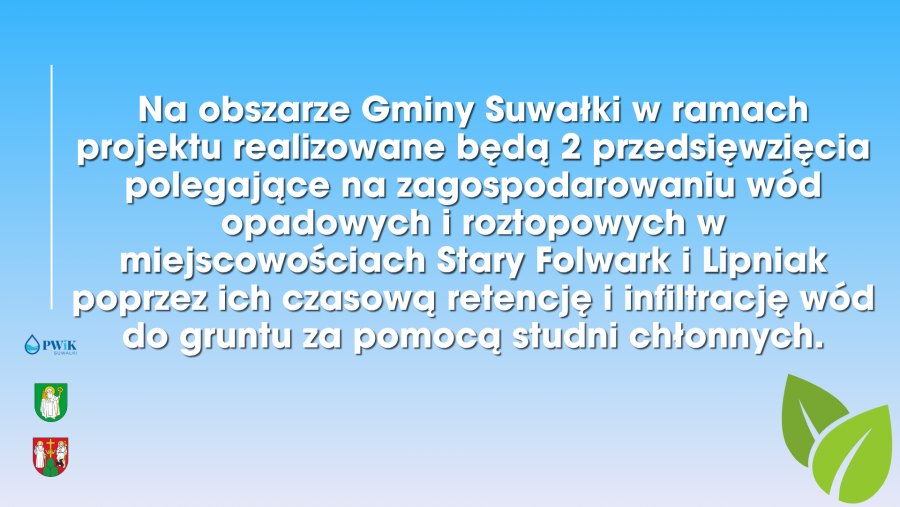 Również Gmina Suwałki aktywnie uczestniczy w projekcie, realizując dwa przedsięwzięcia w Starym Folwarku i Lipniaku, które polegają na zagospodarowaniu wód opadowych i roztopowych poprzez ich czasową retencję i infiltrację do gruntu za pomocą studni chłonnych.
