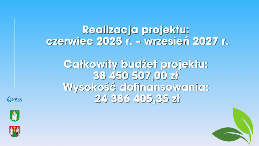 Łączny budżet całego projektu to ponad 38,4 miliona złotych, z czego niemal 24,4 miliona złotych to wnioskowane dofinansowanie. Wkład Miasta Suwałki w tereny zielone to prawie 18,5 miliona złotych, z dofinansowaniem wynoszącym blisko 14,3 miliona złotych. Przedsiębiorstwo Wodociągów i Kanalizacji wnosi ponad 17,2 miliona złotych, z dofinansowaniem wynoszącym niemal 8,4 miliona złotych. Gmina Suwałki partycypuje z kwotą ponad 2 milionów złotych, z dofinansowaniem przekraczającym 1,1 miliona złotych.Realizacja projektu zaplanowana jest na lata 2025-2027, a jego efekty będą widoczne już w najbliższych latach, znacząco poprawiając jakość życia mieszkańców Suwałk i zwiększając odporność miasta na zmiany klimatyczne.