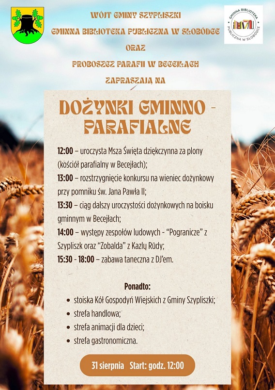 Wójt Gminy Szypliszki, Gminna Biblioteka Publiczna w Słobódce oraz Proboszcz Parafii w Becejłach serdecznie zapraszają na Dożynki gminno-parafialne w Becejłach.