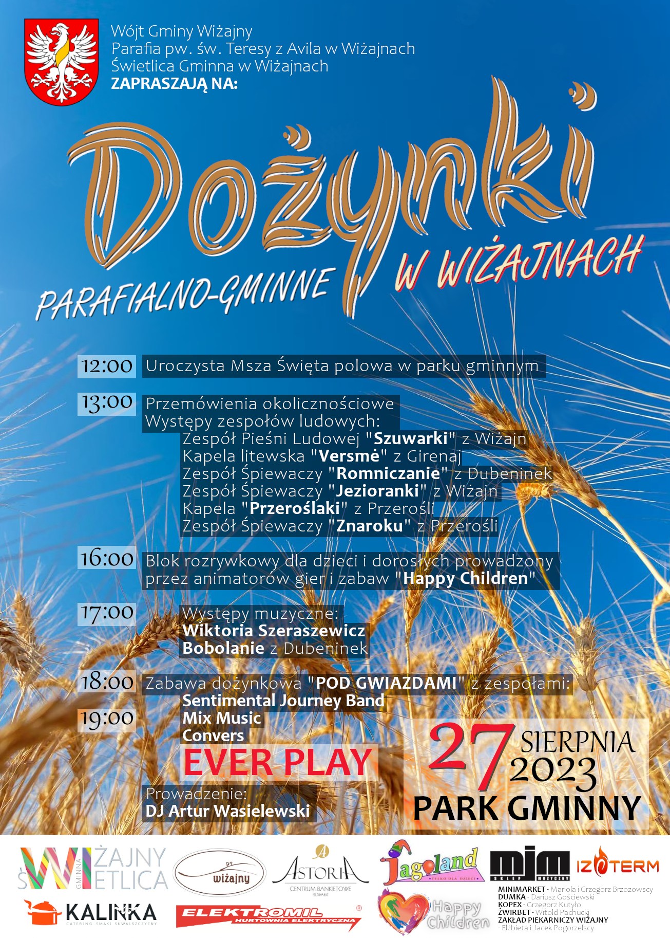 Dożynki rozpocznÄ… siÄ™ mszÄ… Å›w. polowÄ… w parku w Wiżajnach. Po niej nastÄ…piÄ… okolicznoÅ›ciowe przemówienia i wystÄ™py zespoÅ‚ów artystycznych: Szuwarki, Versne, Romniczanie, Jezioranki, PrzeroÅ›laki, Znaroku, Bobolanie, Wiktorii Szeraszewicz, Sentimental Journey Band, Convers oraz Ever Play.