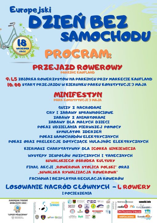 Rowerowy przejazd przez miasto i minifestyn z nagrodami w Parku Konstytucji 3 Maja – to główne punkty niedzielnych obchodów Dnia bez Samochodu w Suwałkach.