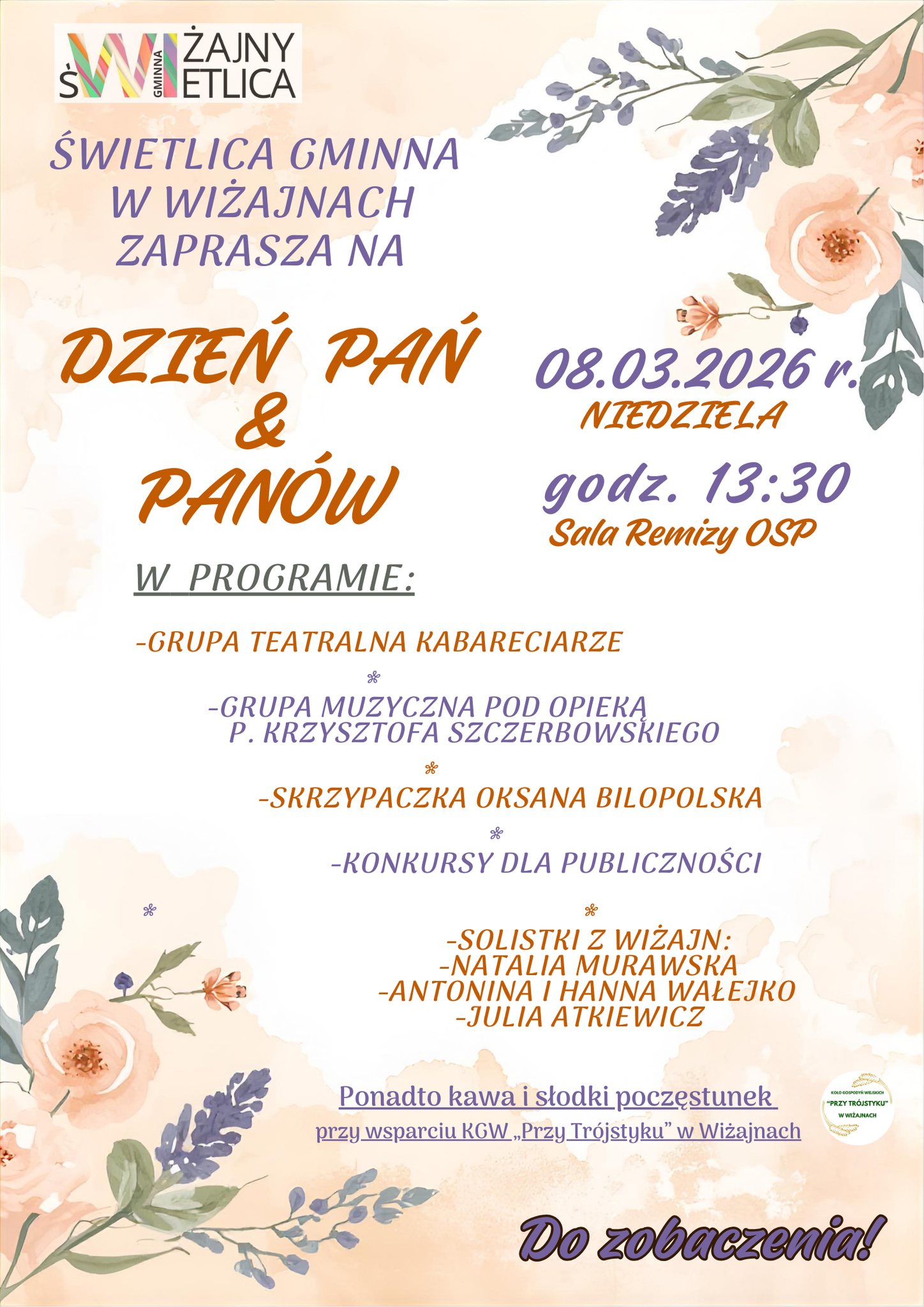 Świetlica Gminna w Wiżajnach serdecznie zaprasza w niedzielę 8 marca o godz.13:30 do sali remizy OSP na na Dzień Pań i Panów.