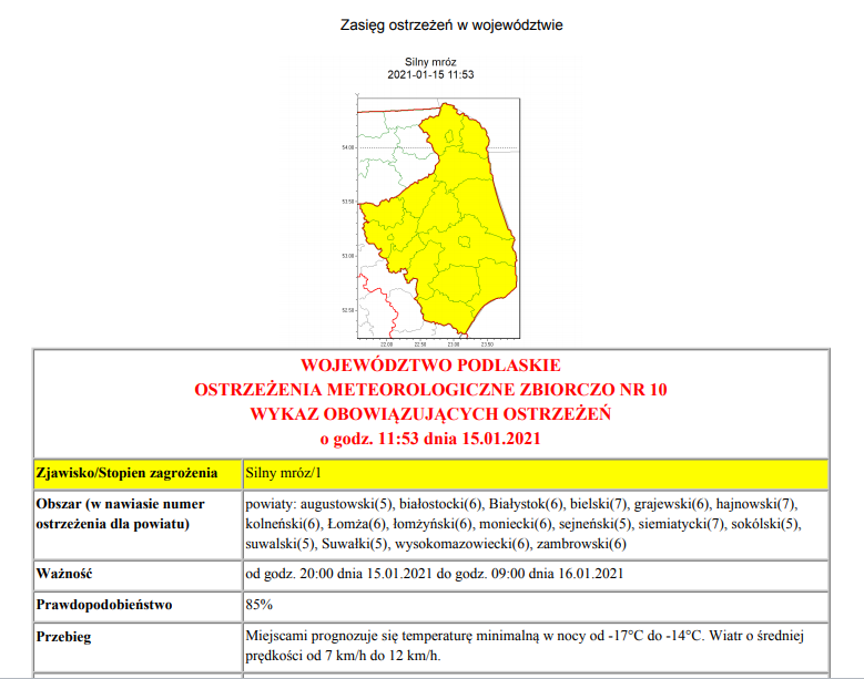 IMGW-PIB Centralne Biuro Prognoz Meteorologicznych - Wydział w Białymstoku wydało ostrzeżenie przed silnym mrozem, który ma nadejść w nocy z piątku na sobotę.