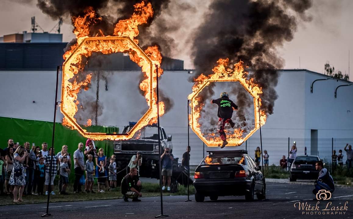 • PRZEJAZDY PRZEZ ŚCIANĘ OGNIA Z CZŁOWIEKIEM NA MASCE,