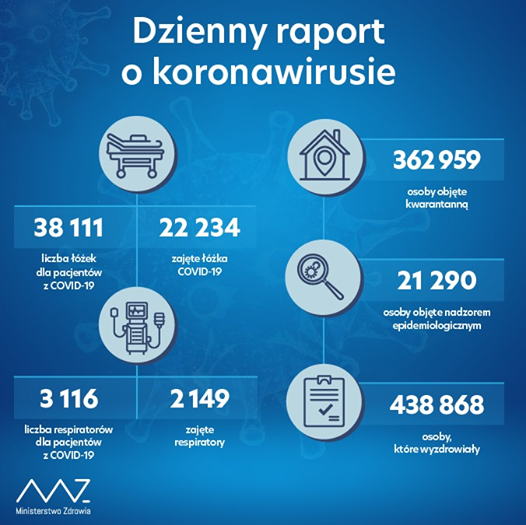 Liczba zakażonych koronawirusem w Polsce wynosi 876 333. Zmarły 13 774, wyzdrowiało 438 868 osób.