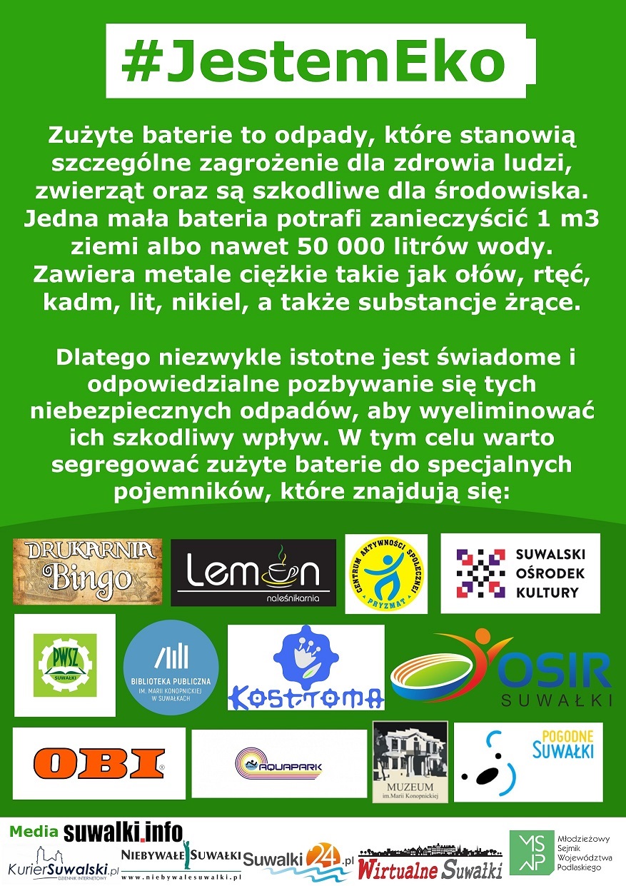 PrzedsiÄ™wziÄ™cie ma uÅ›wiadomić mieszkaÅ„ców SuwaÅ‚k o szkodliwym wpÅ‚ywie baterii na zdrowie ludzi, zwierzÄ…t oraz o niekorzystnym wpÅ‚ywie na Å›rodowisko. Inicjator podaje również lokalizacje, gdzie można wyrzucać zużyte baterie na terenie SuwaÅ‚k.