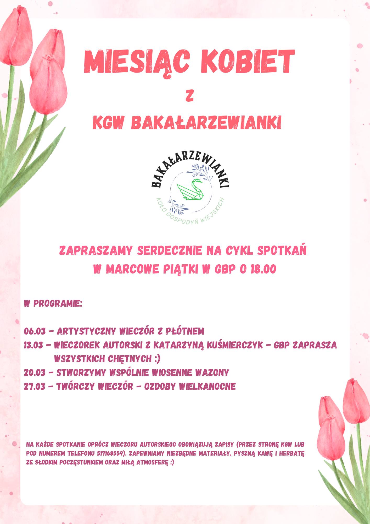 KoÅ‚o GospodyÅ„ Wiejskich „BakaÅ‚arzewianki” z BakaÅ‚arzewa ogÅ‚osiÅ‚o caÅ‚y marzec MiesiÄ…cem Kobiet. Co piÄ…tek, w Gminnej Bibliotece Publicznej Panie z BakaÅ‚arzewa spotykajÄ… siÄ™ na ciekawych zajÄ™ciach.