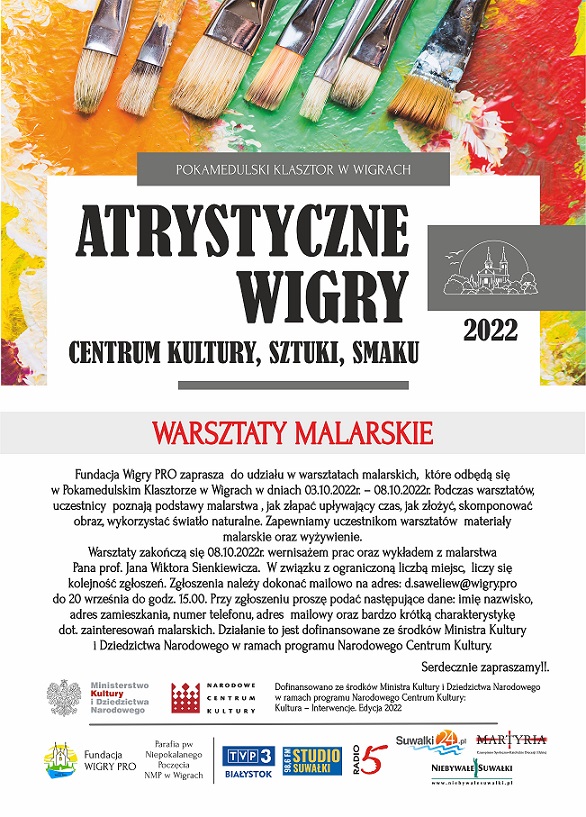 Warsztaty zakończą się 8 października wernisażem prac oraz wykładem malarstwa prof. Jana Wiktora Sienkiewicza. W związku z ograniczoną liczbą miejsc liczy się kolejność zgłoszeń. Zgłoszenia należy dokonać mailowo na adres: d.saweliew@wigry.pro do 20 września, do godz. 15.00.