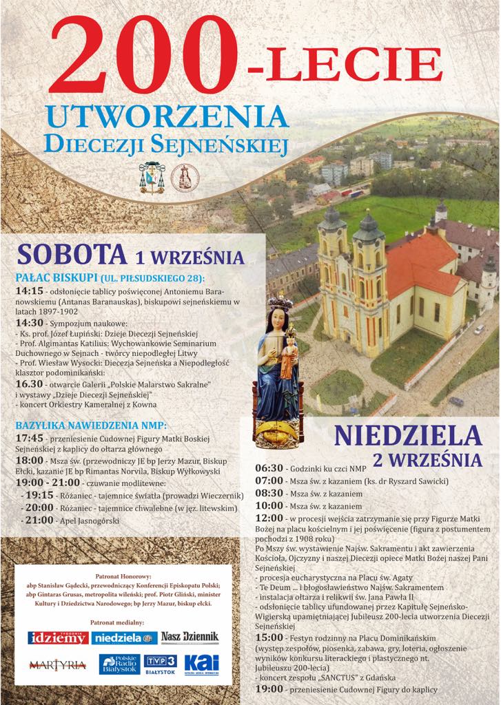 W sobotę i niedzielę, 1 i 2 września w Sejnach odbędą się uroczystości 200-lecia utworzenia diecezji sejneńskiej, która wniosła ogromny wkład w rozwój Sejneńszczyzny i państwa polskiego pod zaborami.