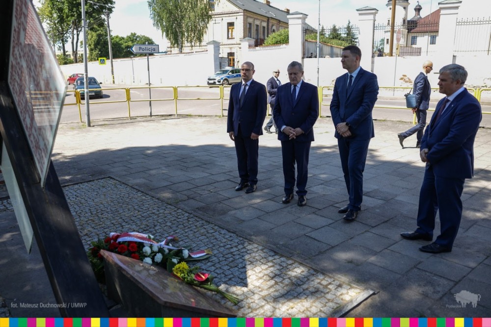 Podczas wizyty w województwie podlaskim (30.06) prof. Piotr Gliński, Wicepremier, Minister Kultury, Dziedzictwa Narodowego i Sportu oraz Simonas Kairys, Minister Kultury Republiki Litewskiej złożyli kwiaty w miejscach pamięci w Sejnach. Towarzyszył im marszałek Artur Kosicki.