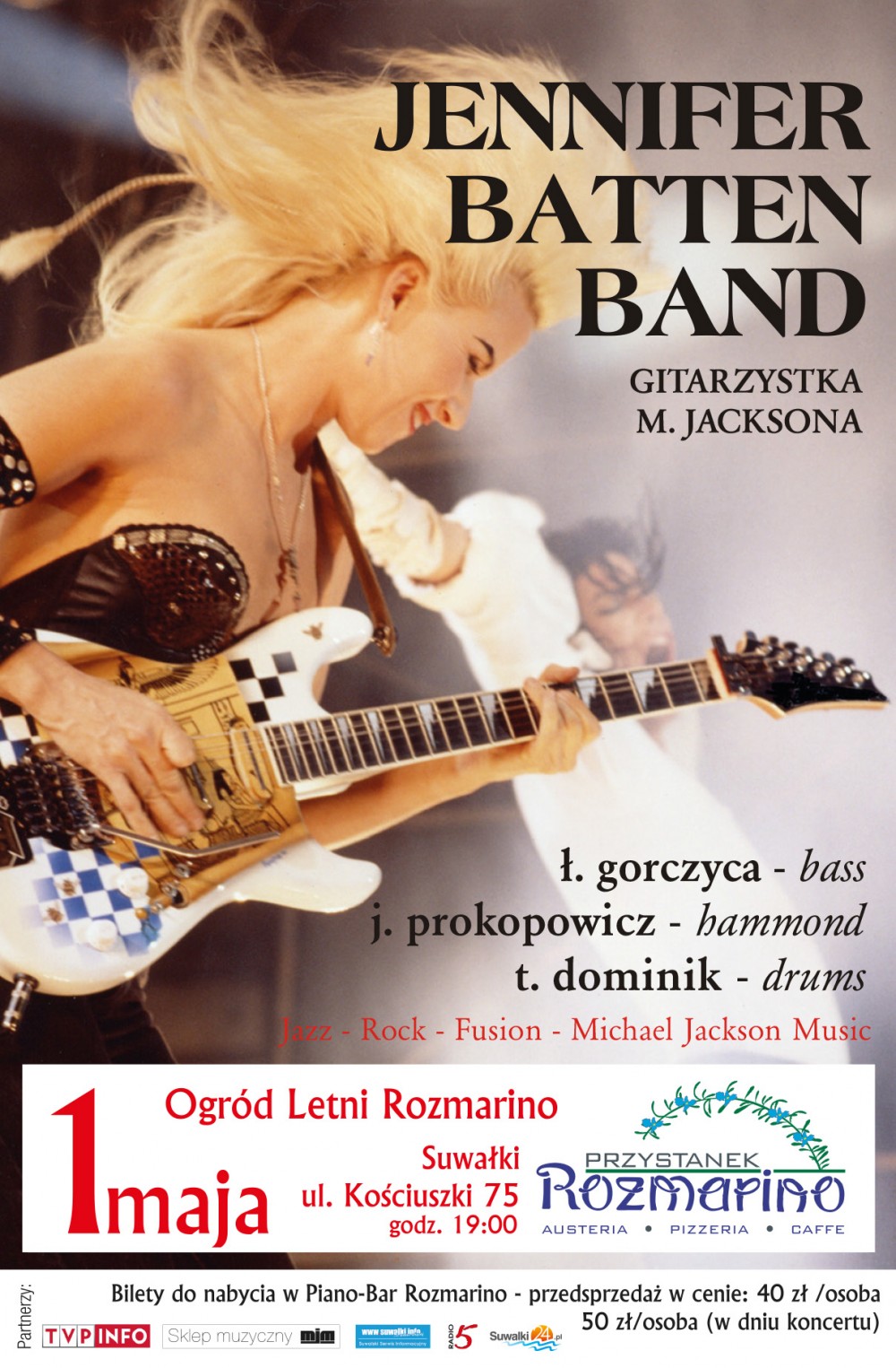 W niedzielę – 1 maja o godz. 19.00 w Rozmarino wydarzenie nad wydarzenia! Na scenie Ogrodu Letniego wystąpi Jennifer Batten - legendarna, uznana na całym świecie gitarzystka. Batten przez 10 lat współpracowała z królem popu Michaelem Jacksonem, grała też z takimi gwiazdami jak Jeff Beck, Carmine Appice, Carl Anderson i Michael Sembello. Przez czytelników najsłynniejszego magazynu gitarowego świata ,,Guitar Player" została wybrana najlepszą gitarzystką świata! Wśród nagrodzonych w innych kategoriach znaleźli się między innymi Eric Clapton, Pat Metheny, Kirk Hammett, Warren Haynes czy Derek Trucks. Koncerty Batten to multimedialne widowisko (obraz + dźwięk). Muzyka z pogranicza rocka, jazzu, fusion, world music budzi zachwyt na całym świecie. Druga część koncertu z zespołem w składzie: Łukasz Gorczyca - bass, Tomasz Dominik - dr, Jacek Prokopowicz - kb. Wstęp na koncert - 40 zł (przedsprzedaż), w dniu koncertu - 50 zł. Wejściówki do nabycia w Piano Barze przy ul. Kościuszki 75.