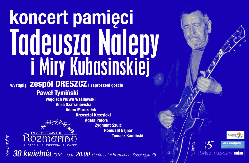 Bluesowo będzie także drugiego dnia Majówki. W sobotę – 30 kwietnia o godz. 20.00 w Ogrodzie Letnim odbędzie się koncert pamięci Tadeusza Nalepy i Miry Kubasińskiej. Wystąpią zespół DRESZCZ i goście: Paweł Tymiński, Wojciech WuWu Wasilewski, Anna Szafranowska, Adam Marszałek, Krzysztof Krzesicki, Agata Patoła, Zygmunt Szulc, Romuald Bejnar i Tomasz Kamiński.