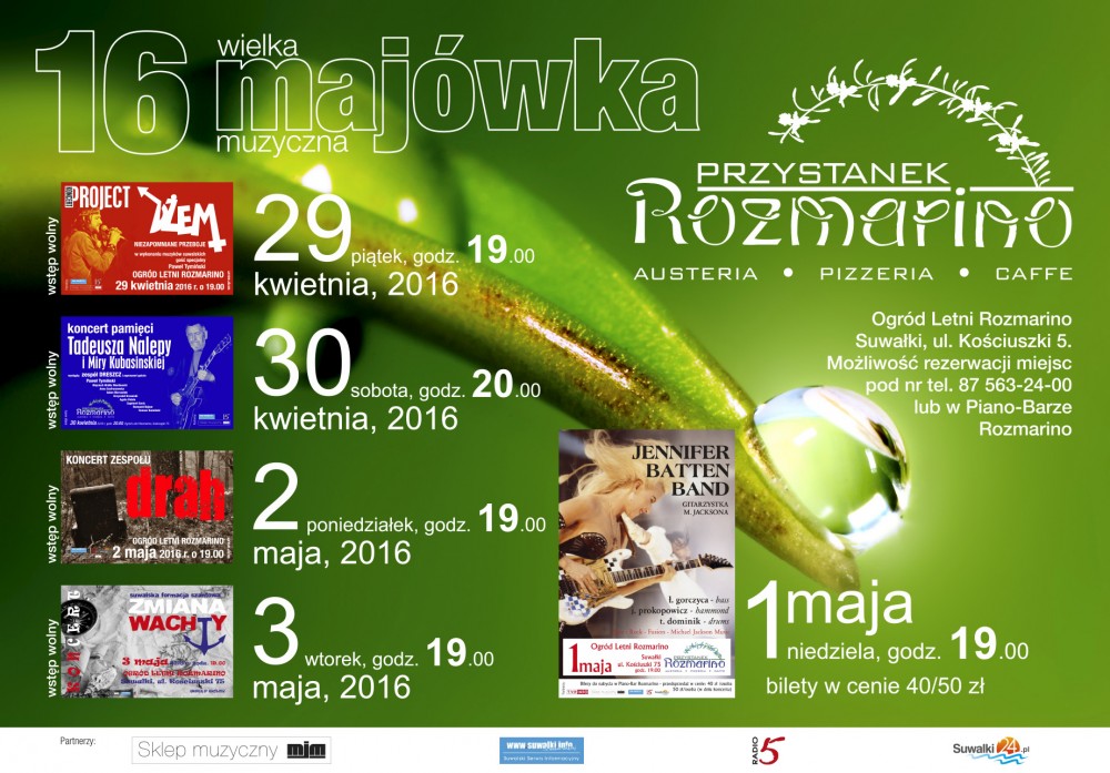 Patronami medialnymi 16. Wielkiej Majówki Muzycznej w Rozmarino są Radio 5, suwalki.info i Suwalki24.pl, partnerem Sklep Muzyczny mjm.