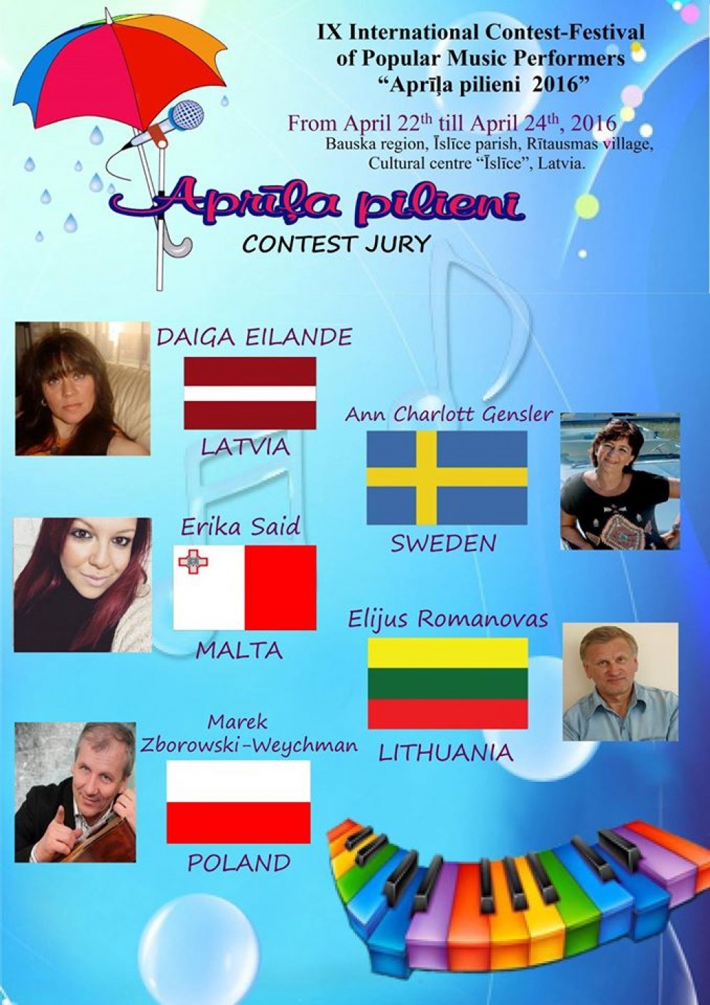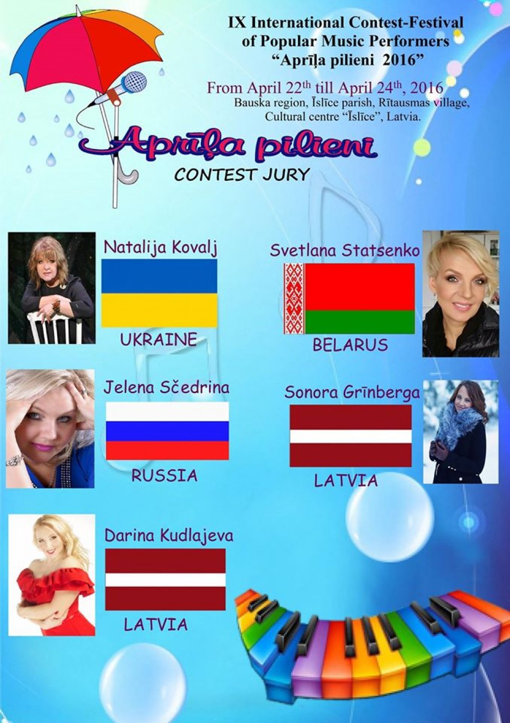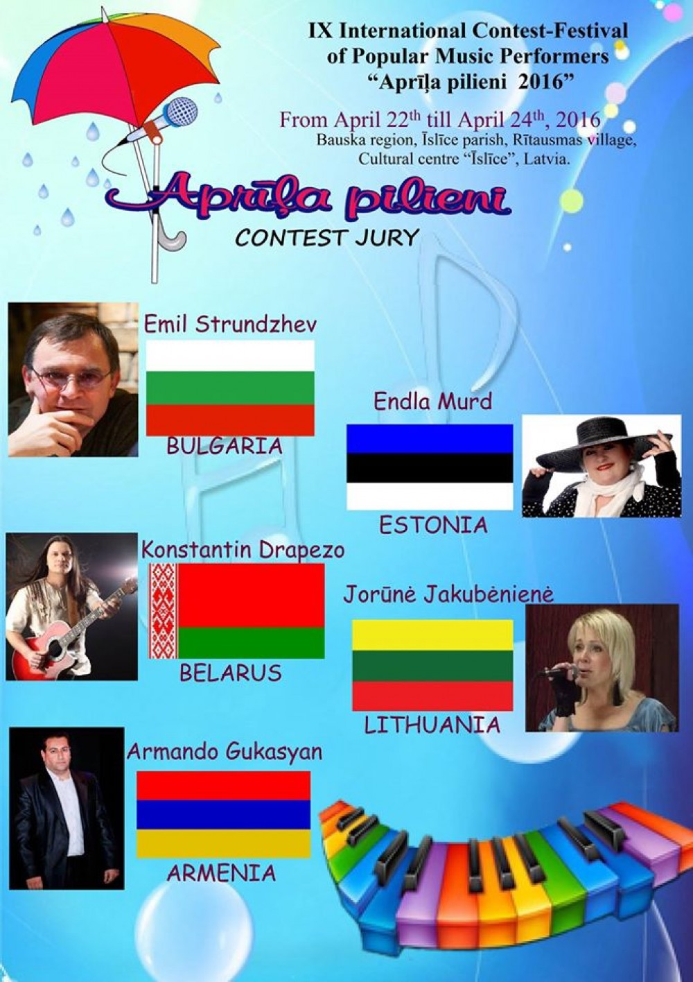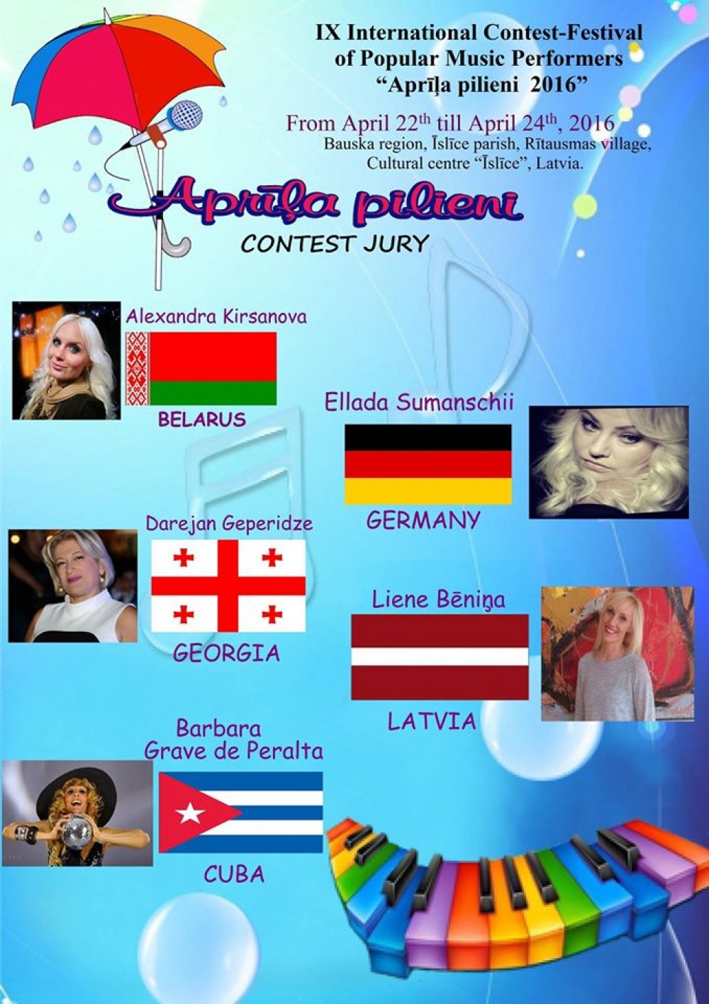 W Konkursie wzięło udział kilkudziesięciu reprezentantów z kilkunastu krajów, m.in. z: Litwy, Łotwy, Estonii, Niemiec, Białorusi, Rosji, Kuby, Armenii czy Malty. W Bauska wystąpiły również Julia Bigielis oraz Julia Pietuszko.
