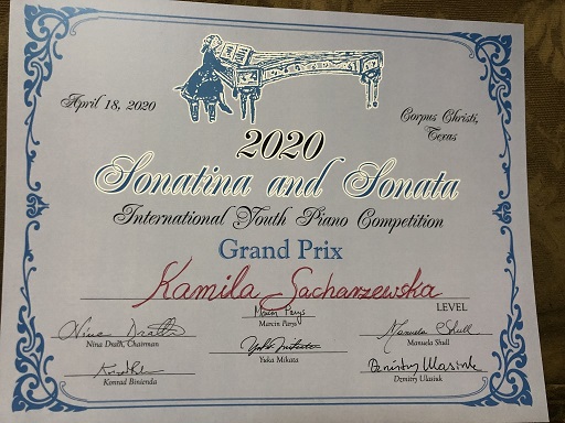 29 marca 2020 r., po wstÄ™pnych przesÅ‚uchaniach na podstawie wczeÅ›niej wysÅ‚anych materiaÅ‚ów DVD z wybranych utworów regulaminowych, Kamila zostaÅ‚a zakwalifikowana do FinaÅ‚u konkursu. Niestety, z powodu koronawirusa, wystÄ™py wirtuozowskie, które miaÅ‚y odbyć siÄ™ w Corpus Christi w USA , zostaÅ‚y odwoÅ‚ane. PianiÅ›ci zaprezentowali swoje wystÄ™py drogÄ… online przez Zoom. Organizatorami konkursu byÅ‚o Towarzystwo im. Fryderyka Chopina w Teksasie.