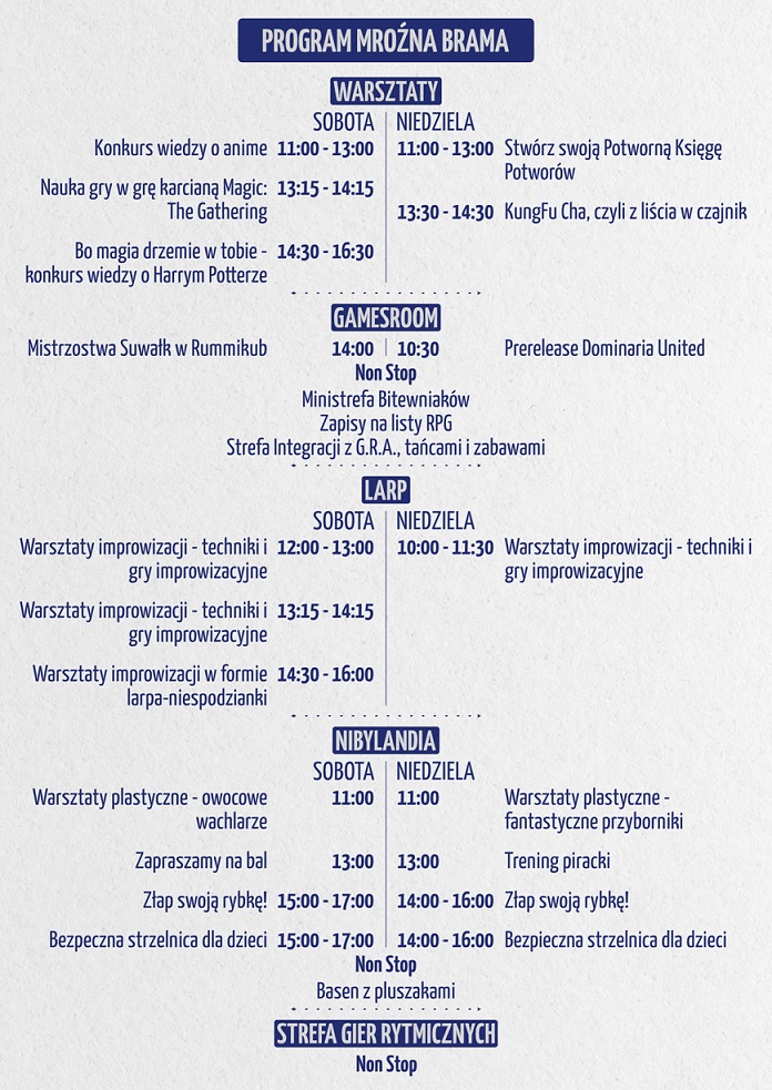 - LARPów — jedyna taka okazja, żeby spróbować swoich sił w grach improwizacyjnych w naszych skromnych Suwałkach. LARPy to sztuka z pogranicza gry i improwizacji, będziecie mieli szansę razem z innymi graczami wcielić się w swoją postać i zagrać razem. Naszych prowadzących możecie pamiętać z innych edycji, są to doświadczeni pasjonaci i miłośnicy sztuki LARPowej.