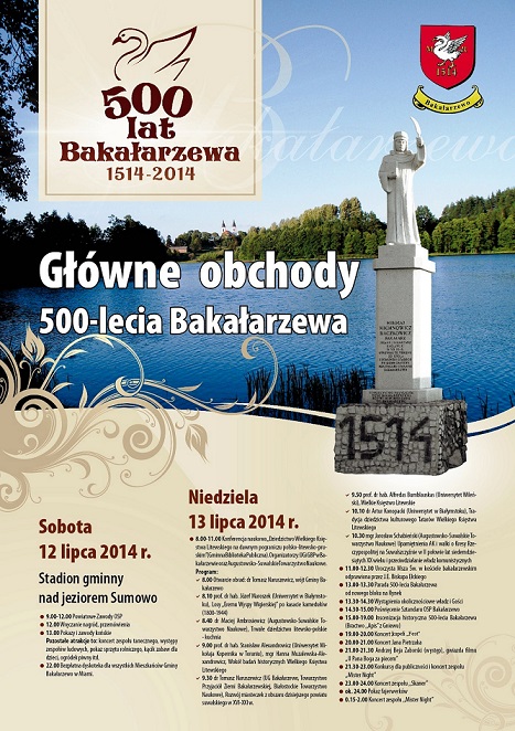 - 8.00-11.00 Konferencja naukowa „Dziedzictwo Wielkiego Księstwa Litewskiego na dawnym pograniczu polsko-litewsko-pruskim” (Gminna Biblioteka Publiczna). Organizatorzy: UG i GBP w Bakałarzewie oraz Augustowsko-Suwalskie Towarzystwo Naukowe. Program: