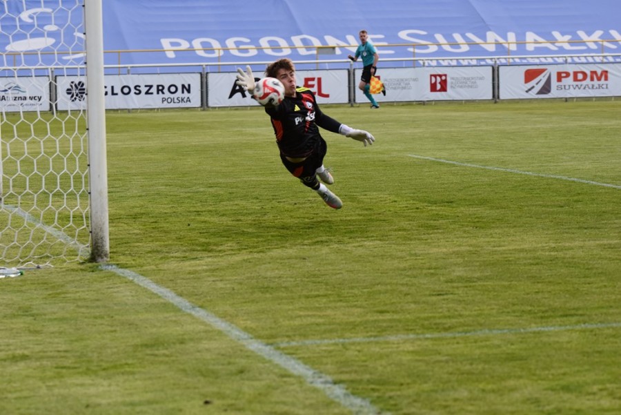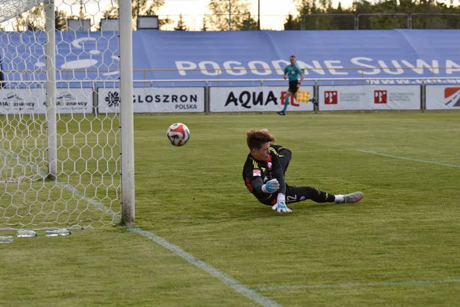Na posterunku, poza kiksem kiedy się poślizgnął na samym początku,  był Mateusz Taudul, ofiarnie zagrożenie oddalali suwalscy defensorzy. W 25 minucie Bartosz Gużewski pięknym prostopadłym podaniem wypuścił na wolne pole Jakuba Lutostańskiego, którego przed własnym polem karnym sfaulował bramkarz Legii II 19-letni Marcel Mendes-Dudziński. Golkiper gości zobaczyl czerwona kartkę i musiał opuścić plac gry. Czy decyzja sędziego była słuszna, można ocenić w materiale wideo.