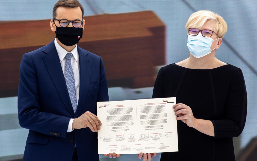 Natomiast premier Polski Mateusz Morawiecki powiedział, że (…) dzisiejszy dzień jest wspaniałą okazją do celebrowania polsko-litewskich stosunków i wspólnej historii. To wielki dzień w naszej historii, który tak dobitnie przypomina o naszych wspaniałych osiągnięciach. Bolesnym momentem jest to, co może nas spotkać, jeżeli popełniamy błędy. Jest dla mnie ogromną radością, że państwo litewskie oraz polskie i nasze dwa narody, zwłaszcza w ostatnich latach, tak dobrze rozumieją nie tylko język przeszłości, ale również przyszłości. Połączyły nas jak osiągnięcia w dziedzinie politycznej, jak też dyplomatycznej, ale w szczególności w dziedzinie kultury, literatury, czy sztuki. Rozumiemy również wyzwania teraźniejszości i przyszłości. Szukamy tego wspólnego mianownika, wszędzie tam, gdzie jest to możliwe. Coraz lepiej nam się to udaje. Bardzo dawno nie było w naszej wspólnej historii tak znakomitego okresu, w jakim się znajdujemy- mówił premier Polski.