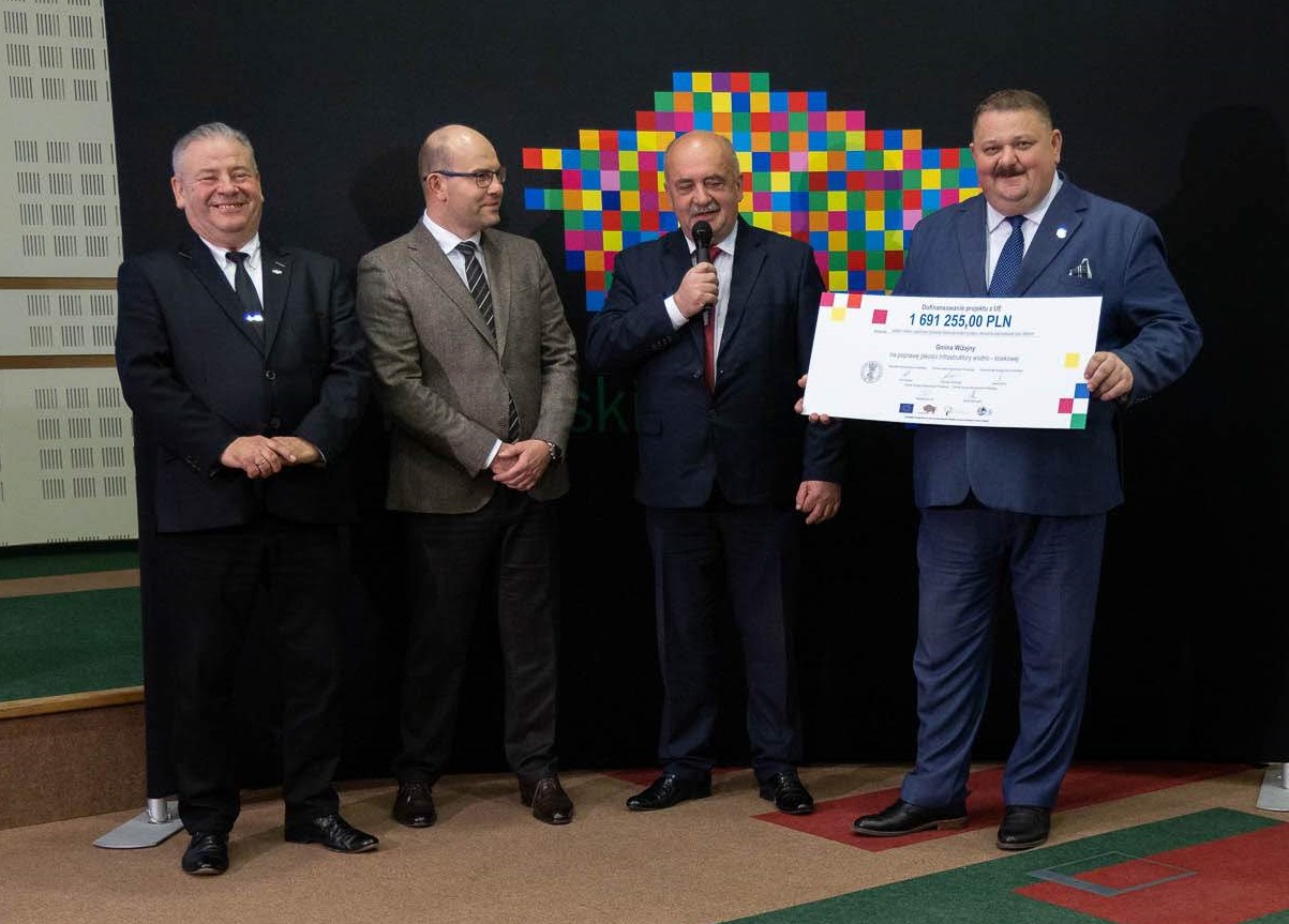 Na fot: Wójt Wiżajn Stanisław Jacek Pietrukiewicz odbiera czek od marszałka na przebudowę oczyszczalni ścieków