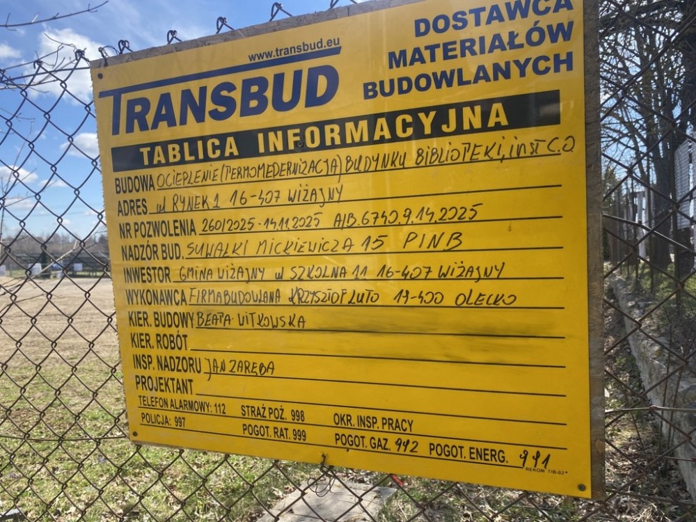 Od tygodnia trwają prace termomodernizacyjne siedziby Biblioteki Gminnej w Wiżajnach. Przetarg wygrała pod koniec marca firma z Olecka. Złożyła najtańszą ofertę, opiewającą na prawie 365 tys. zł.