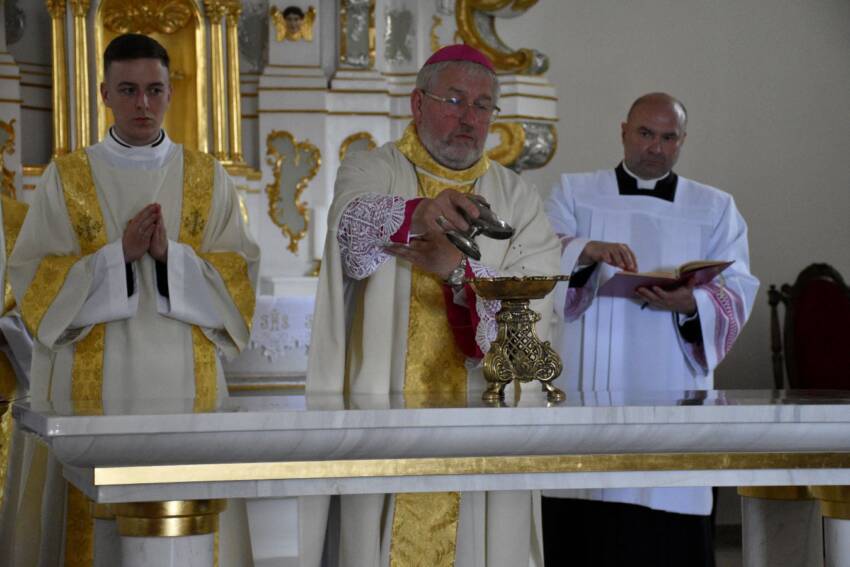 Po homilii nastÄ…piÅ‚ obrzÄ™d konsekracji oÅ‚tarza oraz koÅ›cioÅ‚a. Bp Jerzy rozlaÅ‚ olej Krzyżma Å›w. w piÄ™ciu miejscach oÅ‚tarza – na znak piÄ™ciu ran Chrystusa, a nastÄ™pnie rozprowadziÅ‚ go dÅ‚oniÄ… po caÅ‚ym Stole Ofiarnym, aby uÅ›wiÄ™cić każdy jego fragment. NastÄ™pnie nastÄ…piÅ‚o namaszczenie czterech Å›cian koÅ›cioÅ‚a. ObrzÄ™d ten nawiÄ…zuje do tradycji Starego Testamentu, namaszczania proroków i królów. Na już namaszczonym oÅ‚tarzu ustawiono naczynie z rozpalonymi wÄ™gielkami, na które bp Jerzy naÅ‚ożyÅ‚ kadzidÅ‚o. Jego spalanie ukazuje, że ofiara Chrystusa uobecniona w symbolach chleba i wina wznosi siÄ™ do Boga, jako miÅ‚a woÅ„. Po okadzeniu oÅ‚tarza diakoni okadzili ordynariusza eÅ‚ckiego, a także wszystkich zebranych.