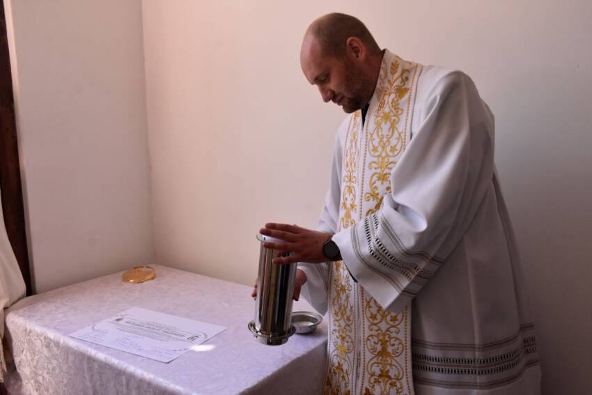 Nowo namaszczony oÅ‚tarz przykryto obrusem, aby móc sprawować na nim EucharystiÄ™. Parafianie w procesji przynieÅ›li również Å›wiece, krzyż oÅ‚tarzowy oraz kwiaty. Po przygotowaniu oÅ‚tarza bp Jerzy Mazur poleciÅ‚ rozpalenie Å›wiec, jako przypomnienie, że Chrystus jest „Å›wiatÅ‚em na oÅ›wiecenie pogan”. Na przygotowanym oÅ‚tarzu rozpoczeÅ‚a siÄ™ Liturgia Eucharystyczna.