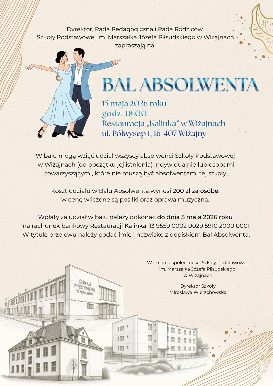Trwają zapisy. Dyrekcja Szkoły, Rada Pedagogiczna i Rada Rodziców zapraszają na Bal Absolwentów. W balu mogą uczestniczyć wszyscy absolwenci szkoły wraz z osobami towarzyszącymi.