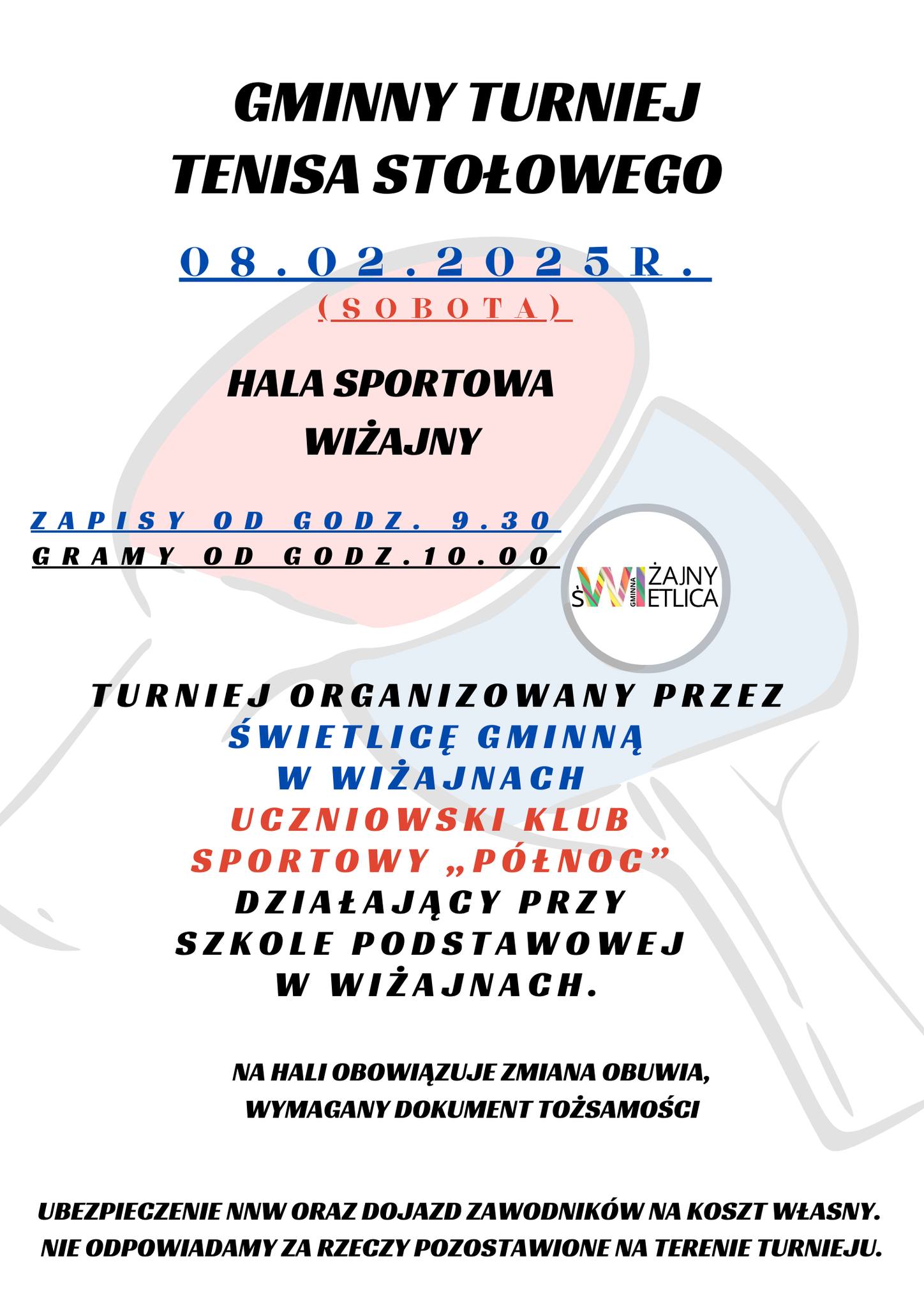 W najbliższą sobotę, 8 lutego Świetlica Gminna w Wiżajnach wraz z Uczniowskim Klubem Sportowym „Północ" organizuje coroczny Gminny Turniej Tenisa Stołowego.