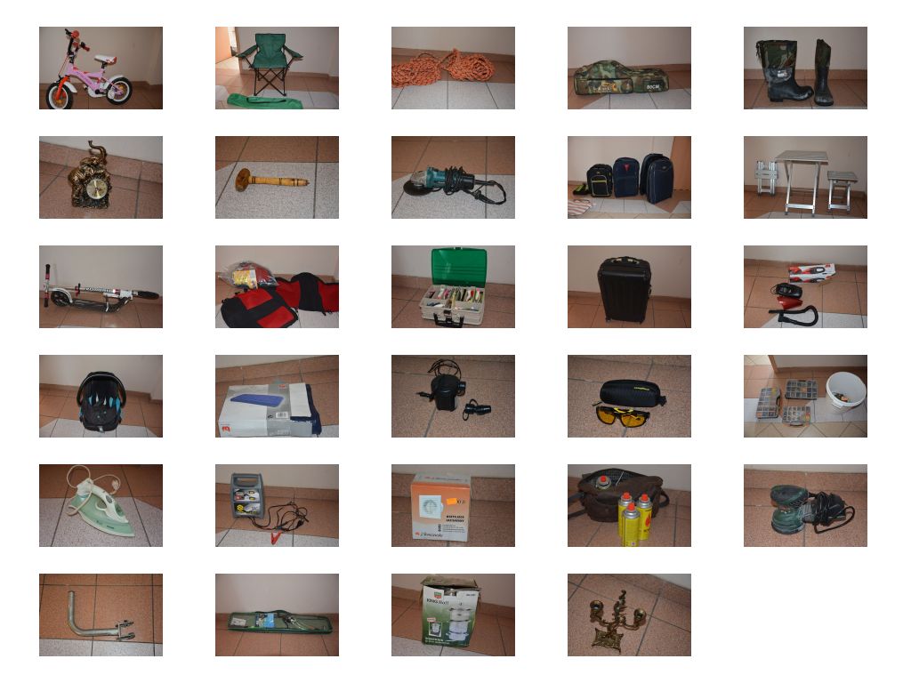 W toku prowadzonych czynności policjanci odzyskali przedmioty m.in. świecznik, sokownik, pudełka z akcesoriami wędkarskimi, hak do anteny, szlifierkę Bosch, torbę z małymi butlami gazowymi, wentylator łazienkowy, prostownik, żelazko, skrzynki z kołkami i wkrętami, okulary w etui, pompkę elektryczną, materac dmuchany, fotelik samochodowy, odkurzacz samochodowy, walizkę czarną, zestaw wędkarski w pokrowcu, pokrowce samochodowe, hulajnogę, stolik z taboretami aluminiowymi, zestaw walizek, szlifierkę kątową, młotek drewniany, zegar-słoń, gumofilce, lina, rowerek dziecięcy.