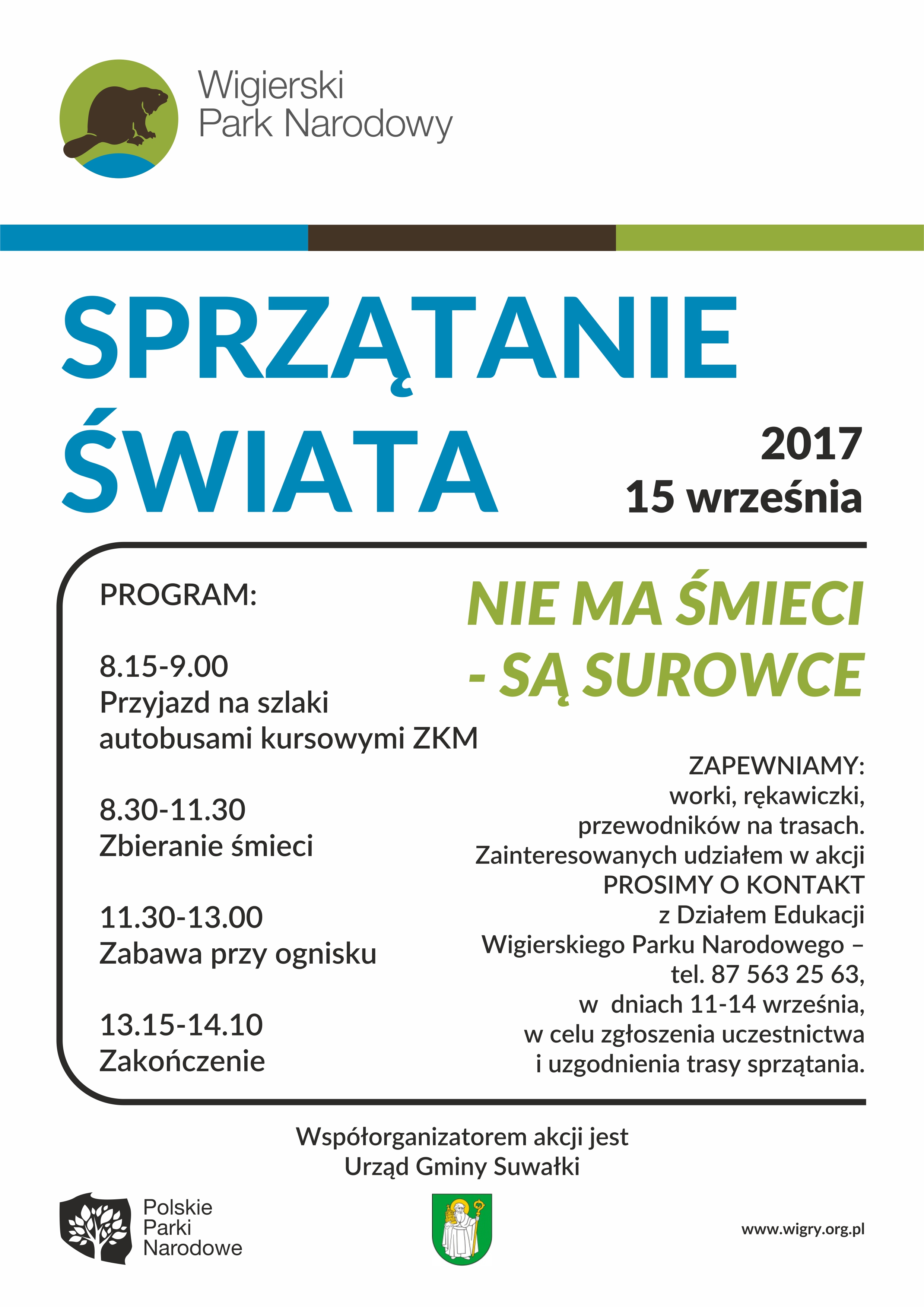 Już w piątek, 15 września br. po raz 24. będziemy sprzątać śmieci na terenie Wigierskiego Parku Narodowego. Tegoroczne Sprzątanie Świata odbywać się będzie pod hasłem przewodnim „Nie ma śmieci – są surowce”. Zapraszamy do udziału w akcji uczniów, lokalne organizacje oraz osoby indywidualne, które są zainteresowane udziałem w sprzątaniu turystycznych szlaków wędrówek pieszych i rowerowych, szczególnie plaż, brzegów jezior i rzek.