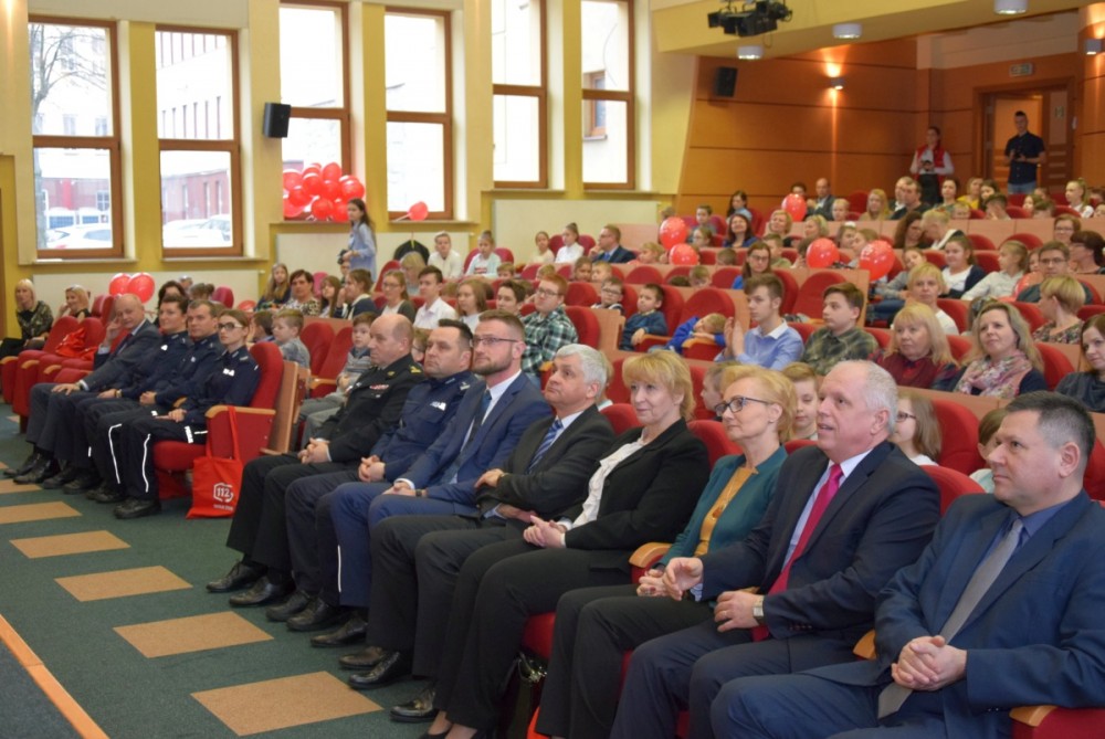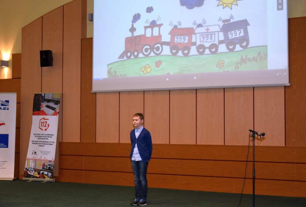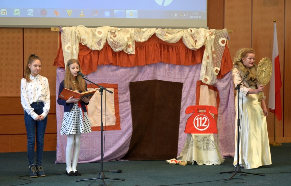 W dalszej części można było obejrzeć dwie najlepsze nagrodzone w konkursie inscenizacje. Najpierw uczniowie klasy V Szkoły Podstawowej im. Bohaterów Monte Cassino w Jasionówce zaprezentowali inscenizację pt. “Śnieżka w opałach – 112 działa!”, a po nich uczniowie klasy VIII Szkoły Podstawowej w Płocicznie-Tartak, przypomnieli zgromadzonym zasady właściwego korzystania z numeru alarmowego 112. Razem z młodzieżą wystąpił p. Piotr Hryniewicki – operator numeru alarmowego 112, który w dalszej części opowiedział o pracy operatorów Centrum Powiadamiania Ratunkowego w Białymstoku.