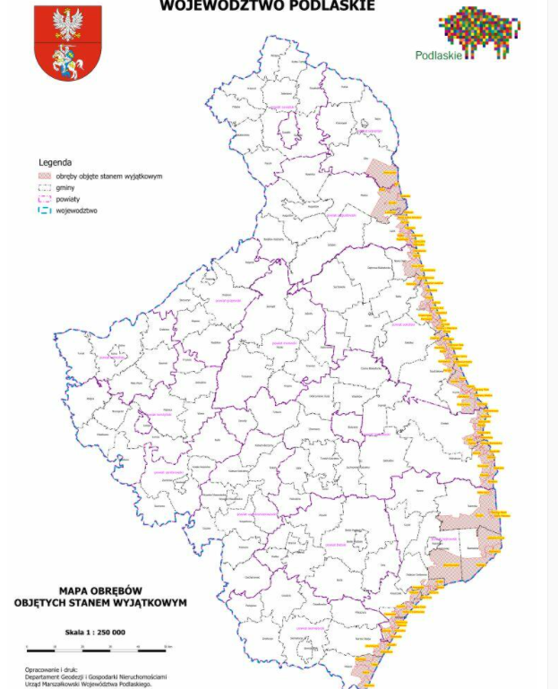 Poglądową mapę administracyjną województwa podlaskiego z naniesionymi obszarami objętymi stanem wyjątkowym w formacie PDF znajdziesz TUTAJ