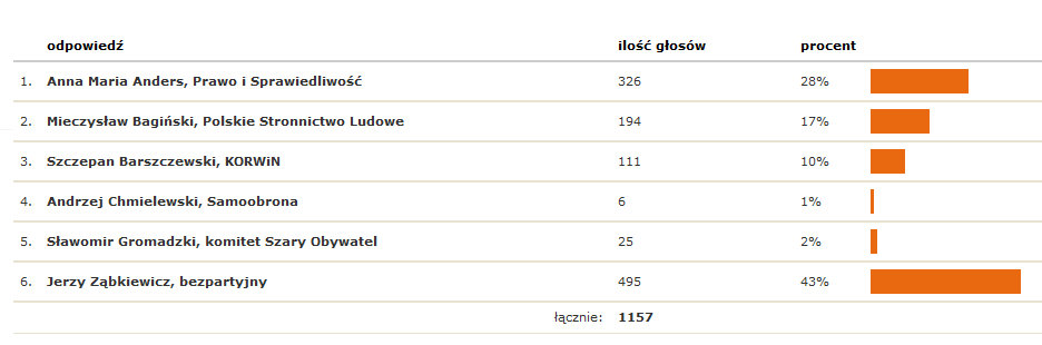Wyniki naszej pierwszej sondy, w której pytaliÅ›my, kto jest PaÅ„stwa kandydatem w zaplanowanych już na najbliższÄ… niedzielÄ™ wyborach uzupeÅ‚niajÄ…cych do Senatu RP, opublikowaliÅ›my przed dwoma tygodniami, 16 lutego. PodkreÅ›lmy, że w naszych sondach w ciÄ…gu doby można oddać jeden gÅ‚os z jednego adresu IP. Wówczas zebraliÅ›my 1158 wskazaÅ„, teraz – 1157.