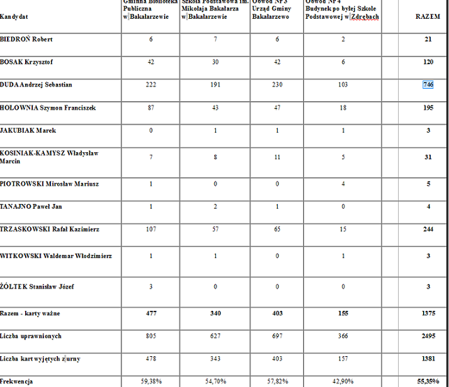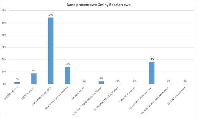 W gminie Bakałarzewo zwyciężył Andrzej Duda, zdobywając 54% wszystkich głosów. Na Rafała Trzaskowskiego głosowało 18% uprawnionych, a na Szymona Hołownię 14%.