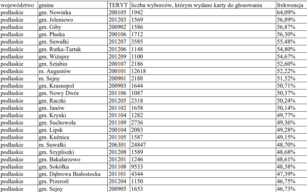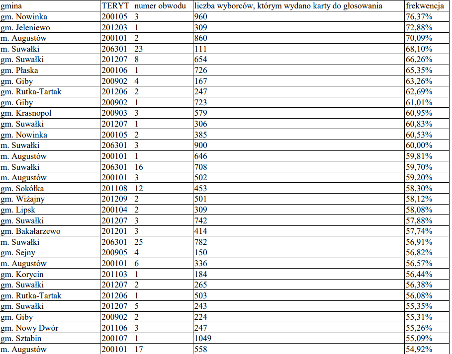 Jeżeli chodzi o obwody, prowadzący dotąd obwód z komisją w Domu Pomocy Społecznej Kalina w Suwalkach spadł na 4. miejsce. Na czoło wysunął się obwód nr 3 w Nowince z niezwykle wysoką frekwencją 76,37 proc. Ponad 70 proc. wyborców zagłosowało też w obwodzie nr 1 w Jeleniewie z komisją w OSP Bachanowo w Błaskowiźnie.