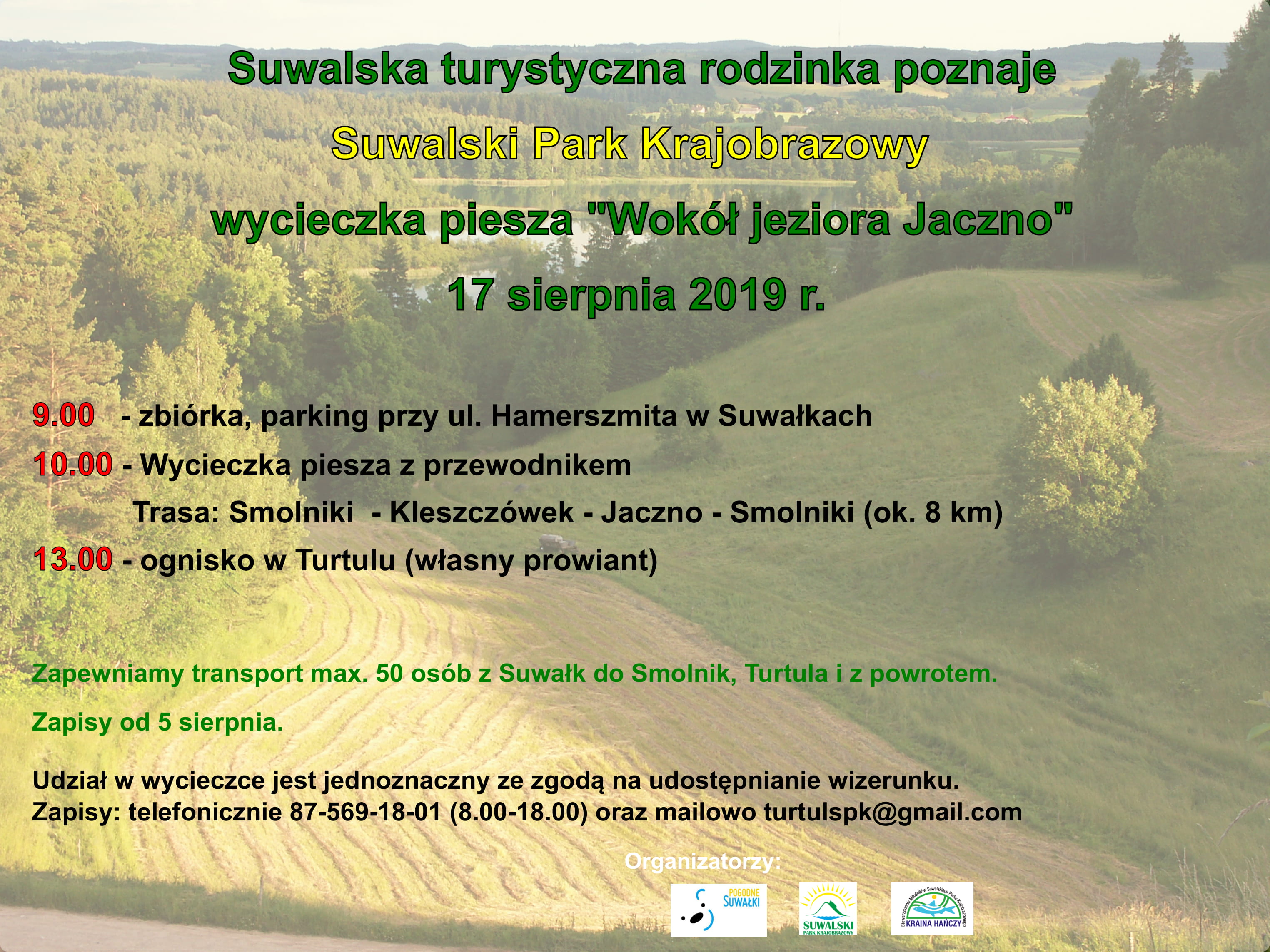 W trakcje wycieczki uczestnicy bÄ™dÄ… mieli okazjÄ™ zobaczyć panoramÄ™ smolnickÄ… z punktu widokowego "Telimena", poznać historiÄ™ mÅ‚yna wodnego na rzece Jacznówce, wejść na punkt widokowy "Na ozie", z którego rozpoÅ›ciera siÄ™ widok na jezioro Jaczno. KoÅ„cowym punktem wycieczki bÄ™dzie ognisko w siedzibie Suwalskiego Parku Krajobrazowego w Turtulu (prowiant we wÅ‚asnym zakresie).