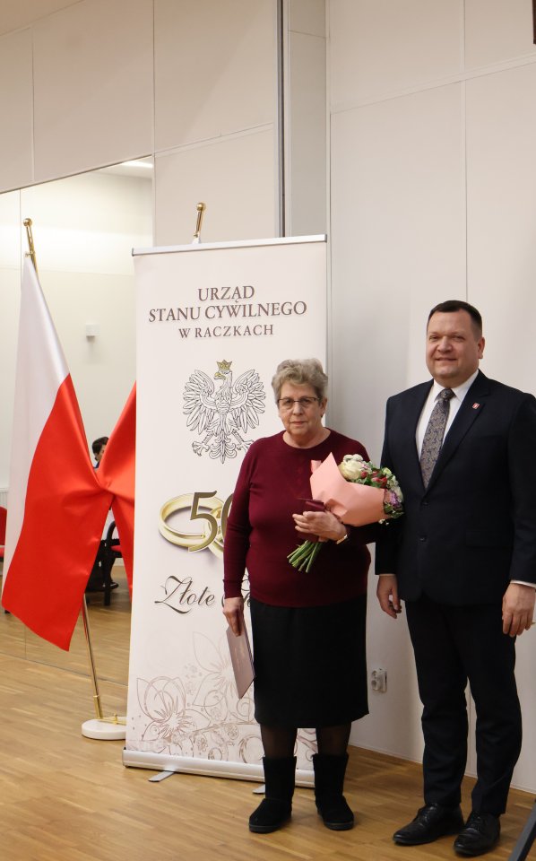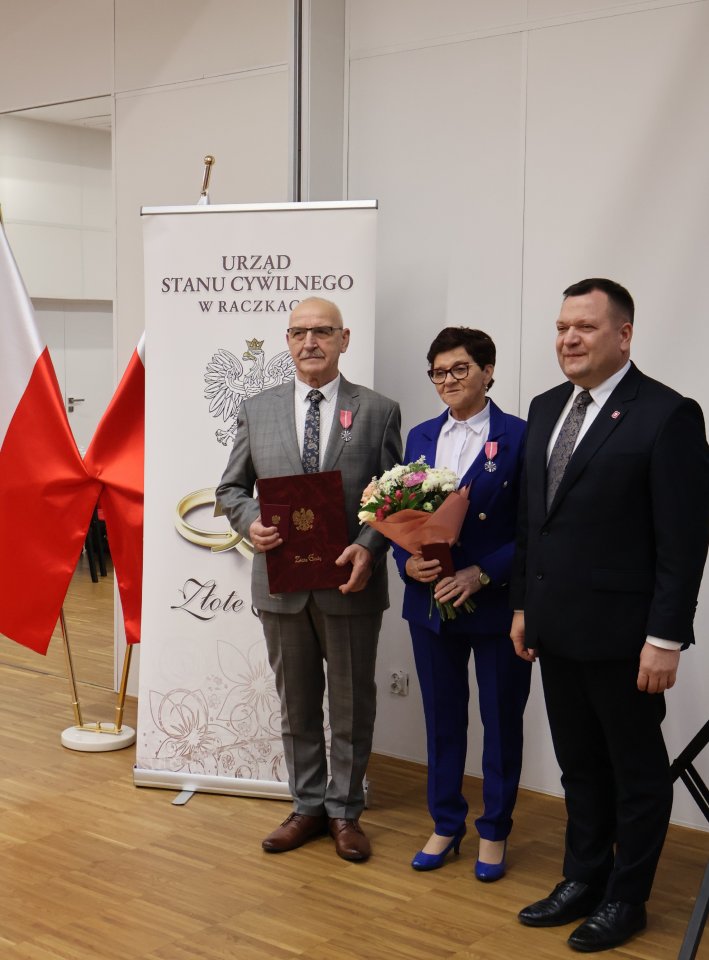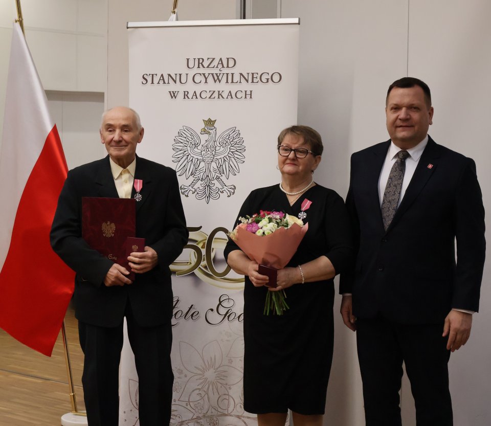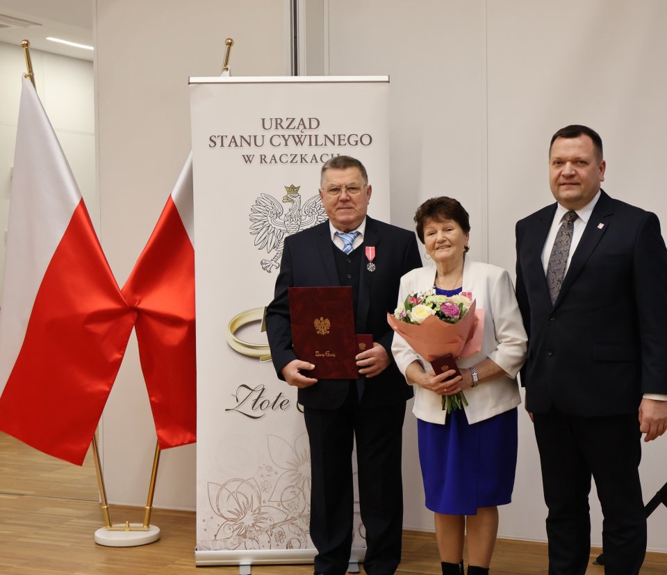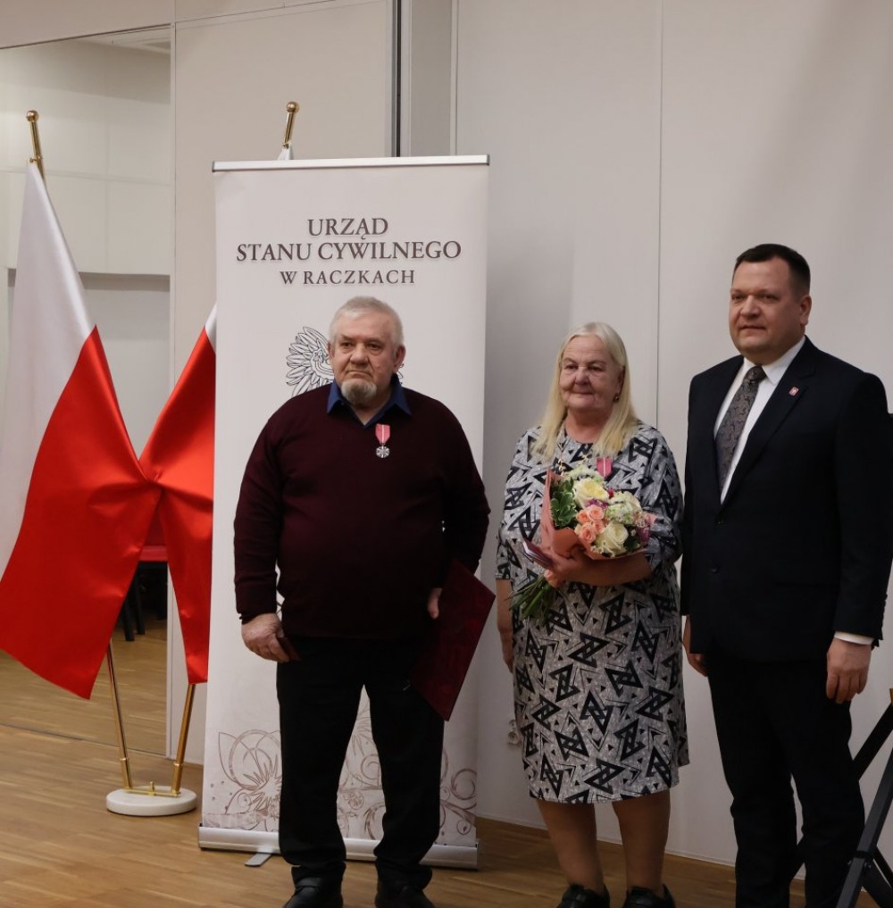 Uhoronowania medalami ,,Za DÅ‚ugoletnie Pożycie MałżeÅ„skie” dokonali Piotr Gajda, Wójt Gminy Raczki oraz Emilia Tertel, Kierownik UrzÄ™du Stanu Cywilnego w Raczkach.