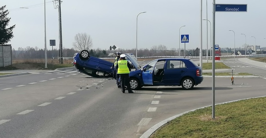 Kobieta kierująca skodą, wyjeżdżając z ulic Sianożęć wymusiła pierwszeństwo, uderzyła w bok i doprowadziła do dachowania prawidłowo jadącego ulicą 100-lecia Niepodległości samochodu Ośrodka Szkolenia Kierowców.