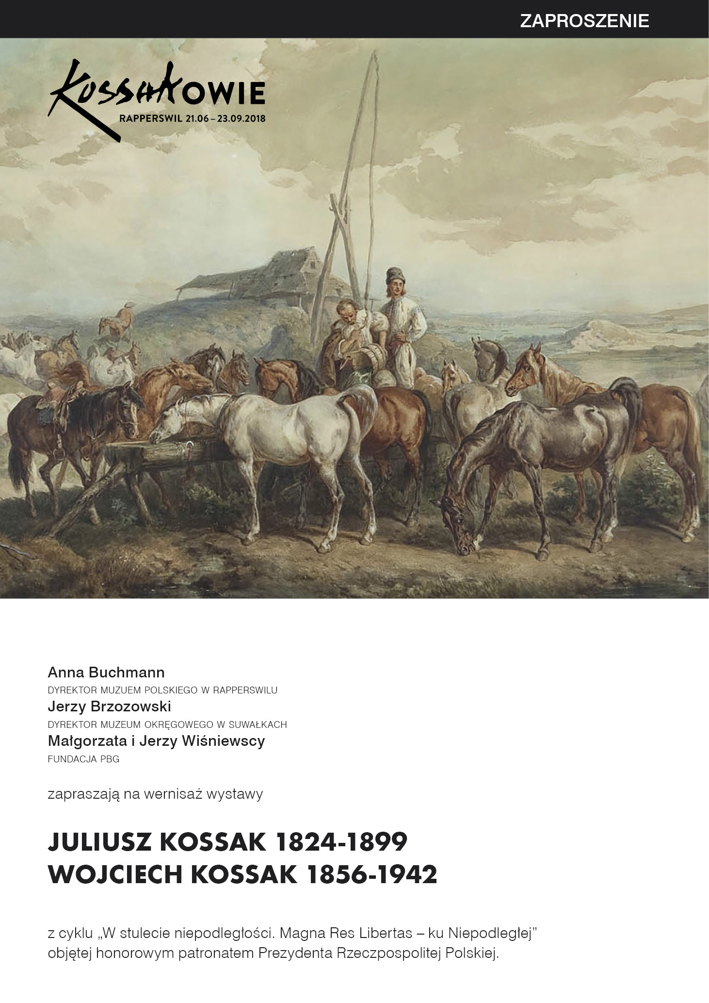 W niedzielę, 2 września, o godz. 14.00 w Polskim Muzeum w Rapperswil (Szwajcaria) odbędzie się uroczysty wernisaż wystawy „Juliusz Kossak 1824-1899 Wojciech Kossak 1856-1942". Wystawa objęta jest Patronatem Narodowym Prezydenta Rzeczypospolitej Polskiej Andrzeja Dudy w stulecie odzyskania niepodległości.