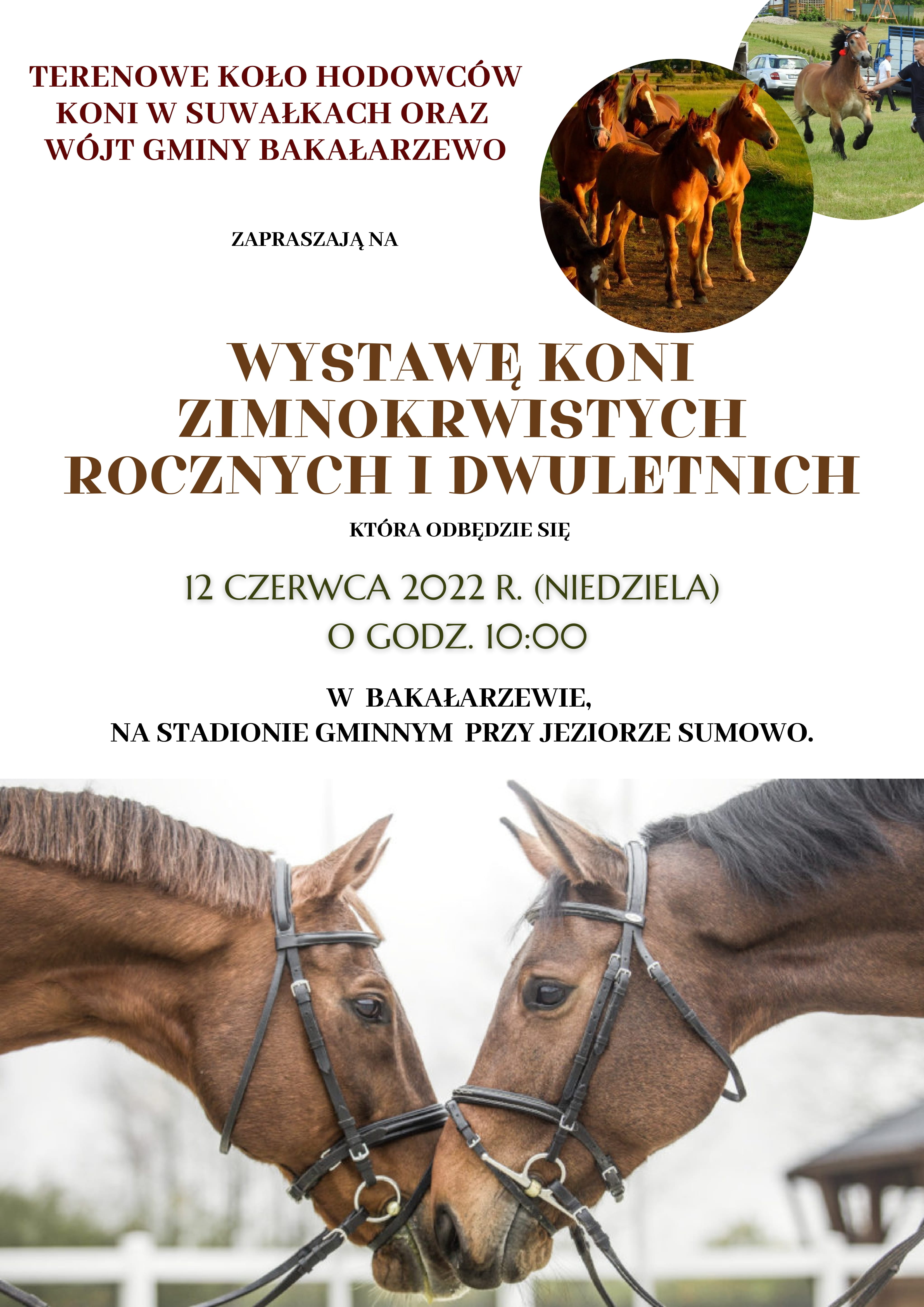 Terenowe Koło Hodowców Koni w Suwałkach oraz Wójt Gminy Bakałarzewo zapraszają na Wystawę koni zimnokrwistych rocznych i dwuletnich.