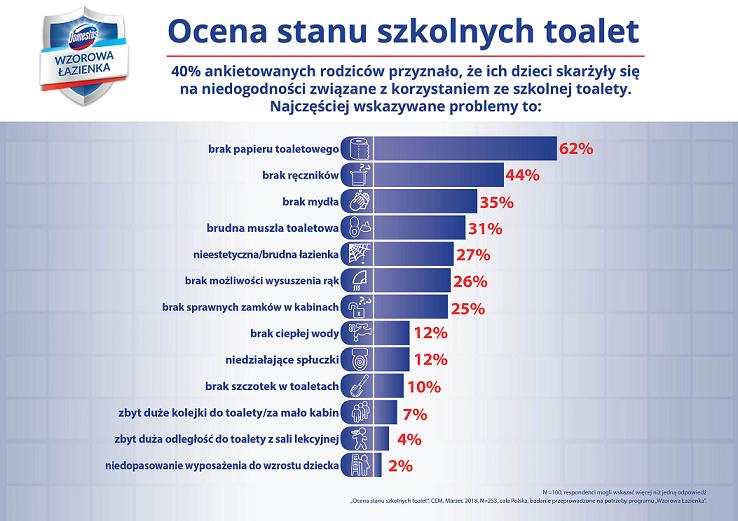 W badaniu „Ocena stanu szkolnych toalet” 2 przygotowanym na potrzeby programu „Wzorowa Łazienka” aż 40% ankietowanych rodziców przyznało, że ich dzieci skarżyły się na niedogodności związane z korzystaniem ze szkolnej toalety, najczęściej wskazując na brak lub niewystarczającą ilość papieru toaletowego, brak mydła i ręczników do wytarcia rąk oraz brudną muszlę klozetową. Problemem są także nieestetyczne łazienki oraz brak sprawnych zamków w kabinach toaletowych.